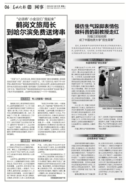 在制作短视频科普的过程中,刘福江和学生特别看重内容的可读性,往往能由浅入深,结合身边的具体案例,用网友喜闻乐见的语言讲解背后知识。“花岗岩为什么这么硬?”“提拉米苏雪是怎么形成的?”“AI能取代地质勘探工作吗?”这些问题都能在刘福江的视频里找到答案。很多粉丝是高中生或是准备考研的大学生,还有家长分享给自己的孩子。有网友表示,刘老师是“我在‘地大’唯一的人脉”。