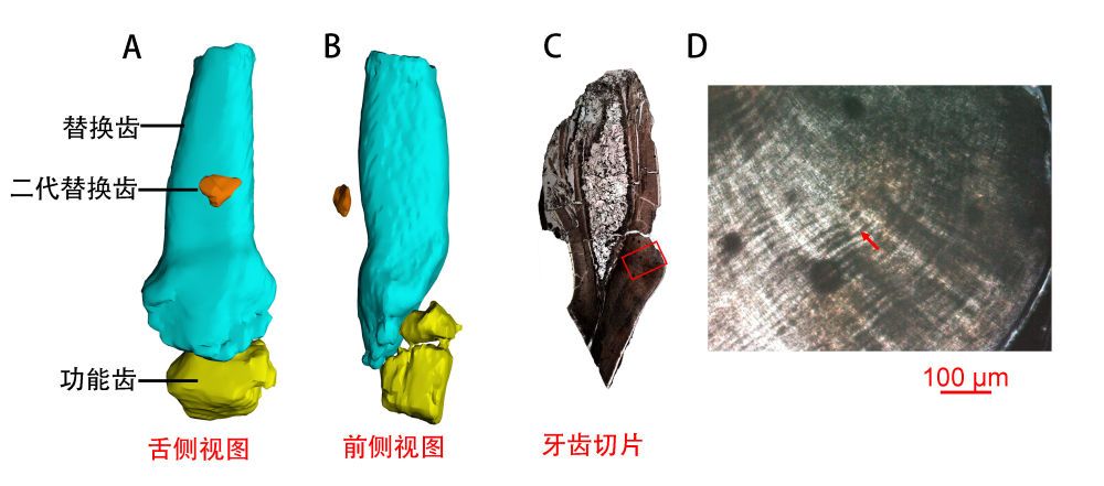 图为上园热河龙上颌齿二代替换齿示意图和牙齿切片。(米兰milan官方网站(武汉)地球科学学院供图)