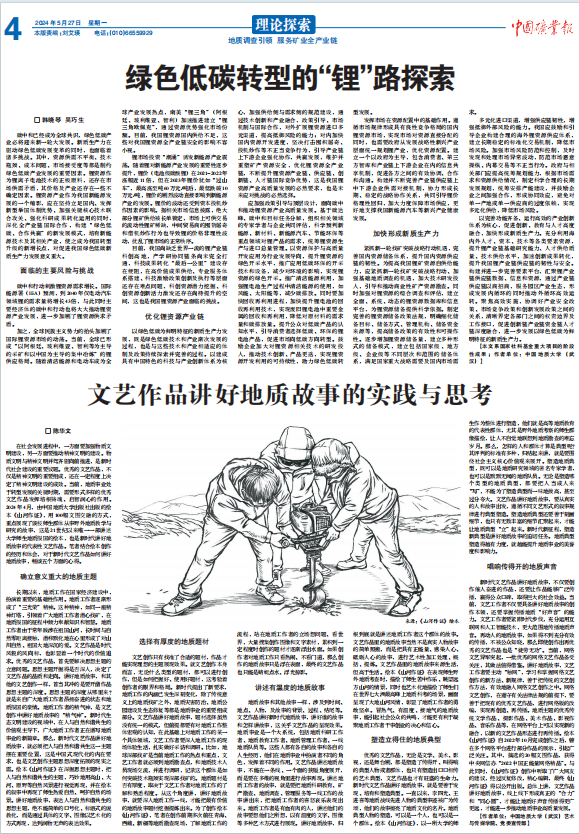新时代文艺作品讲好地质故事,不仅要创作催人奋进的作品,还要让作品能够广泛传播,赢得公众口碑,取得巨大的社会效益。当前,文艺工作者不仅要具备讲好地质故事的创作本领,还要掌握传播地质“好声音”的能力。文艺工作者要紧跟时代步伐,充分运用互联网和人工智能技术,更大范围地传播地质声音。再动人的地质故事,如果得不到充分有效的传播,不被公众知晓,那么即使创作出再优秀的文艺作品也是“徒劳无功”。当前,网络文艺异军突起,一批优秀的网络文艺作品备受关注,其做法值得借鉴。讲好地质故事,文艺工作者要主动“触网”,学习和掌握网络文艺创作的新方法、新规律,善于把传统的文艺创作方法,有效地融入网络文艺创作之中。网络文艺创作,在遵守有关法律法规的前提下,要善于把现有的优秀文艺作品,进行网络版的改编,实现再创造、再传播。地质主题的优秀传统文学作品、摄影作品、美术作品、影视作品、音乐作品等,在网络平台上可以实现新的融合,以新的文艺作品形态进行再传播。绘本《山河作证》自2022年10月完成创作之后,曾在多个网络平台进行部分作品的展示,引起广泛关注。其中,摘选的20幅文图作品,获得中央网信办“2022中国正能量网络精品”。与此同时,《山河作证》创作中听取了广大网友的建议,经过反复修改,精心编辑,最终《山河作证》得以公开出版。总体上讲,文艺作品讲好地质故事,线上线下形成真正的“合力”和“同心圆”,才能让地质好声音传播得更广更远,才能进一步推动地质事业高质量发展。