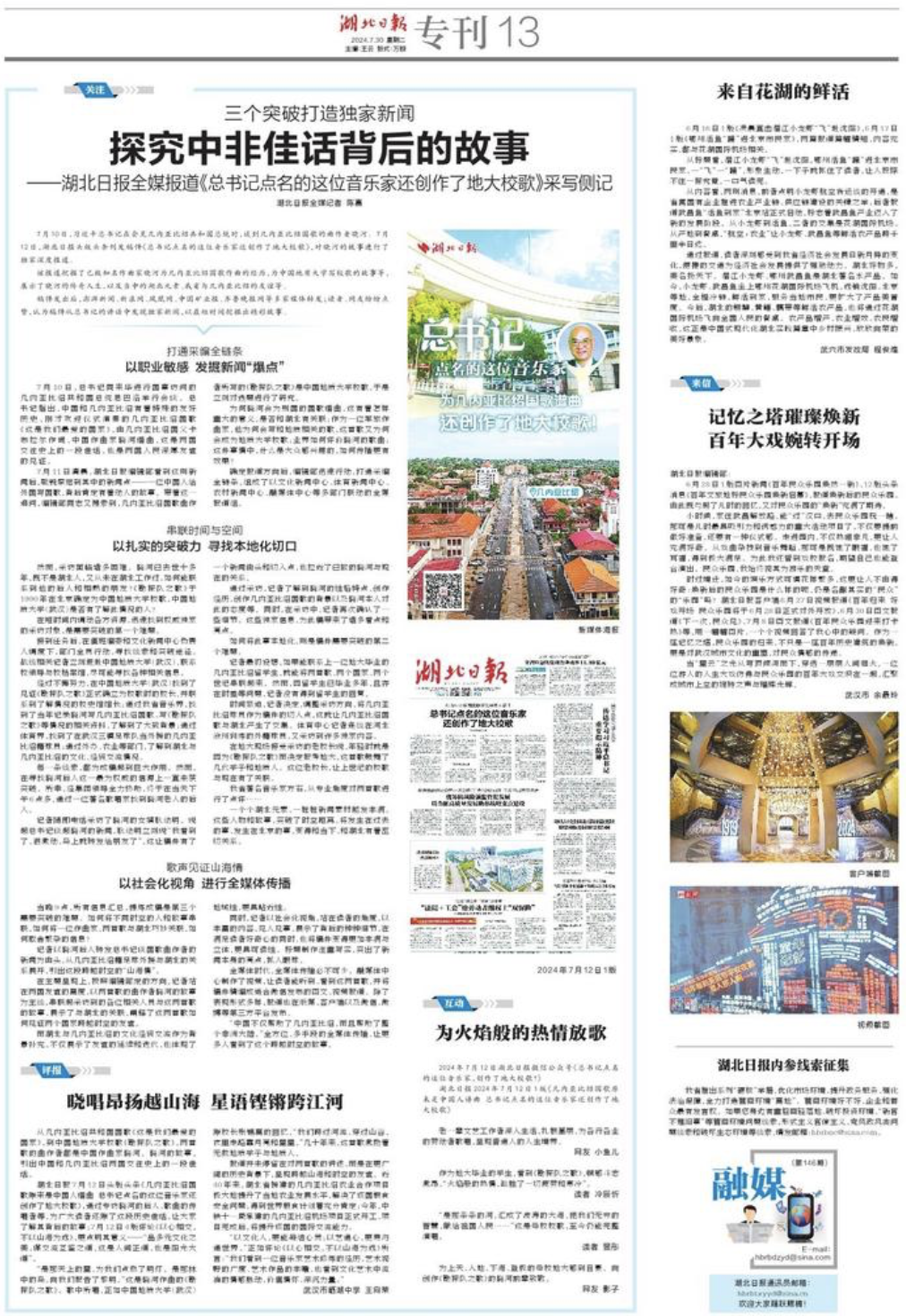 湖北日报7月12日头版头条《几内亚比绍国歌原来是中国人谱曲 总书记点名的这位音乐家还创作了地大校歌》,通过专访晓河的后人、歌曲的传唱者等,为广大读者还原了这段历史佳话,让大家了解其背后的故事;7月12日4版评论《以心相交,不以山海为远》,更点明其意义——“品多元文化之美,谋交流互鉴之道,这是人间正道,也是阳光大道”。