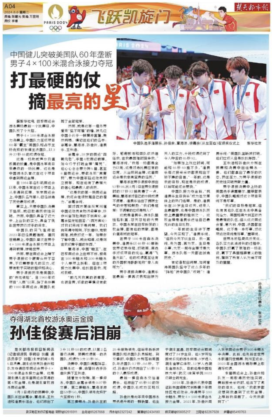 楚天都市报极目新闻讯(记者胡迪凯 李碗容 狄鑫 通讯员李宁 刘璐)北京时间8月5日凌晨,湖北运动员孙佳俊和队友夺得巴黎奥运会男子4×100米混合泳接力金牌。这是湖北健儿在本届奥运会获得的第4枚金牌,也是湖北首枚游泳奥运金牌。