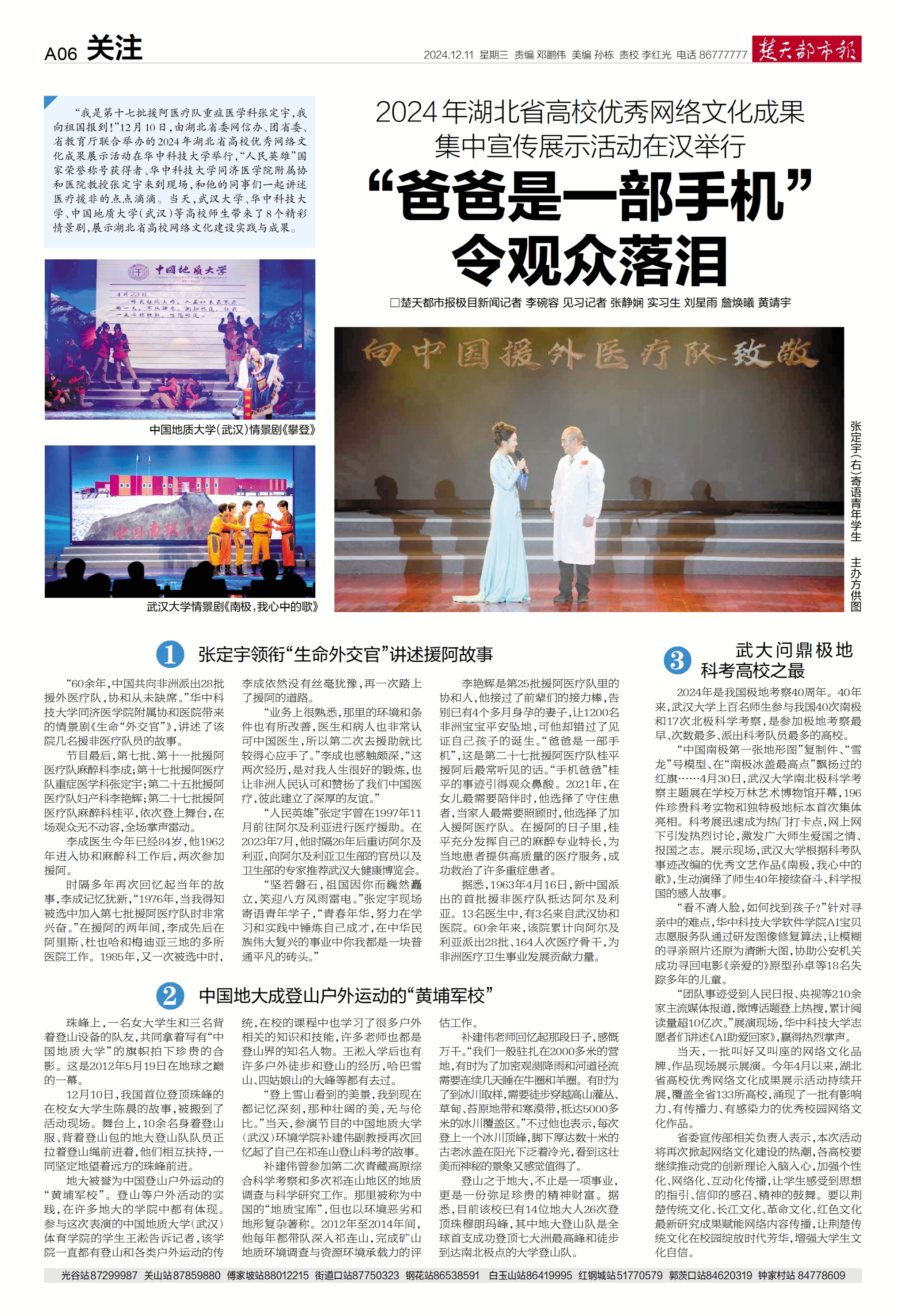“我是第十七批援阿医疗队重症医学科张定宇,我向祖国报到!”12月10日,由湖北省委网信办、团省委、省教育厅联合举办的2024年湖北省高校优秀网络文化成果展示活动在华中科技大学举行,“人民英雄”国家荣誉称号获得者、华中科技大学同济医学院附属协和医院教授张定宇来到现场,和他的同事们一起讲述医疗援非的点点滴滴。当天,武汉大学、华中科技大学、米兰milan官方网站(武汉)等高校师生带来了8个精彩情景剧,展示湖北省高校网络文化建设实践与成果。
