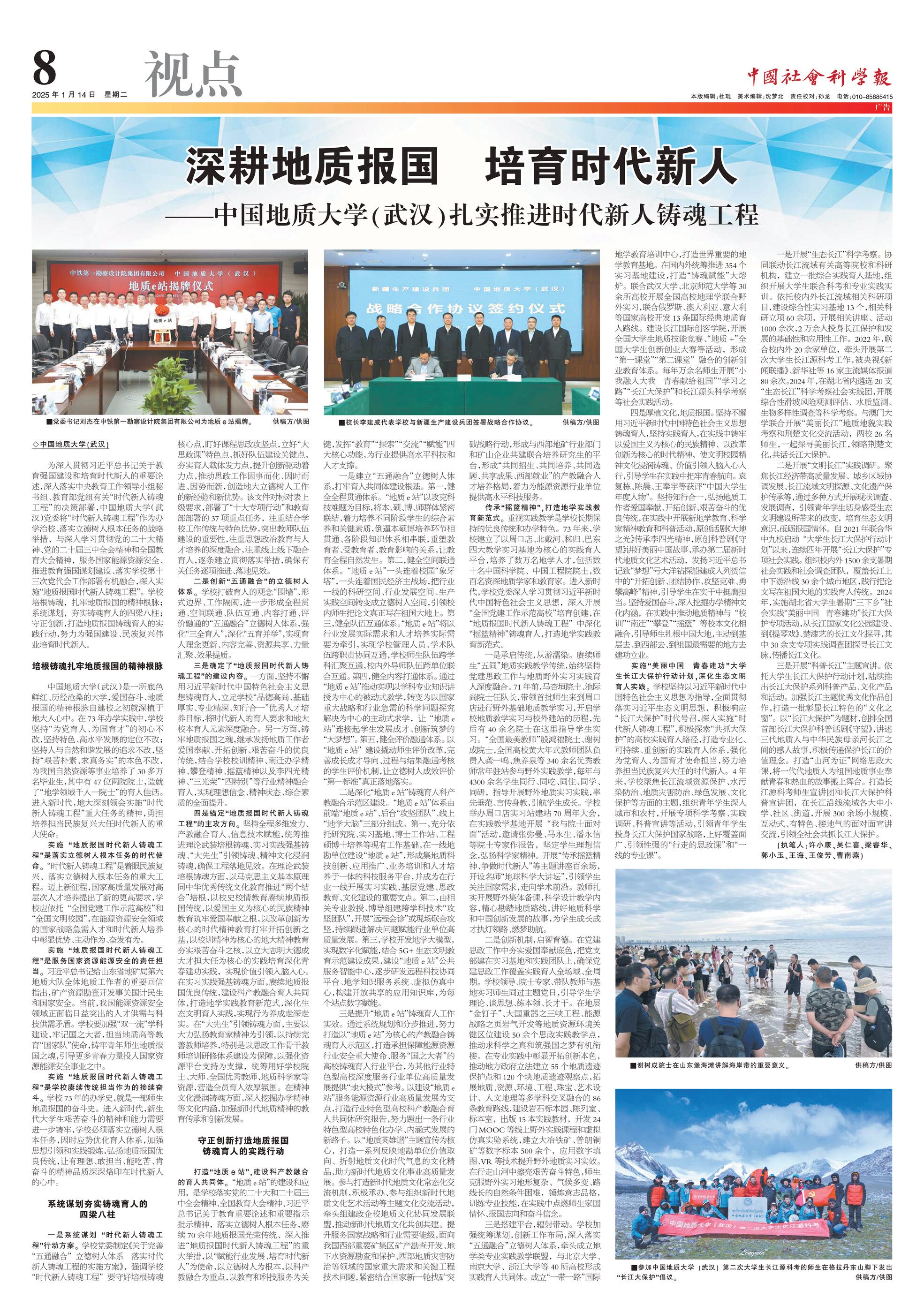 四是锚定“地质报国时代新人铸魂工程”的主攻方向。坚持全程多维发力、产教融合育人、信息技术赋能,统筹推进理论武装培根铸魂、实习实践强基铸魂、“大先生”引领铸魂、精神文化浸润铸魂,确保工程落地见效。在理论武装培根铸魂方面,以马克思主义基本原理同中华优秀传统文化教育推进“两个结合”培根,以校史校情教育赓续地质报国传统,以爱国主义为核心的民族精神教育筑牢爱国奉献之根,以改革创新为核心的时代精神教育打牢开拓创新之基,以校训精神为核心的地大精神教育夯实艰苦奋斗之核,以立大志明大德成大才担大任为核心的实践培育深化青春建功实践,实现价值引领入脑入心。在实习实践强基铸魂方面,赓续地质报国优良传统,建设科产教融合育人共同体,打造地学实践教育新范式,深化生态文明育人实践,实现行为养成走深走实。在“大先生”引领铸魂方面,主要以大力弘扬教育家精神为引领,以持续完善教师培养,特别是以思政工作骨干教师培训研修体系建设为保障,以强化资源平台支持为支撑,统筹用好学校院士、大师、全国优秀教师、地质科学家等资源,营造全员育人浓厚氛围。在精神文化浸润铸魂方面,深入挖掘办学精神等文化内涵,加强新时代地质精神的教育传承和创新发展。