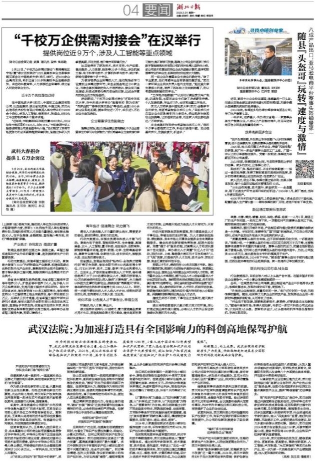 活动期间,“千校万企供需对接会”还同步在武汉大学、华中科技大学举办“珞樱有约 职为你来”“筑梦远航”“春季校园双选会”等活动,全国1600余家企业现场招聘,提供岗位近7万个,吸引近5万名毕业生参加活动。