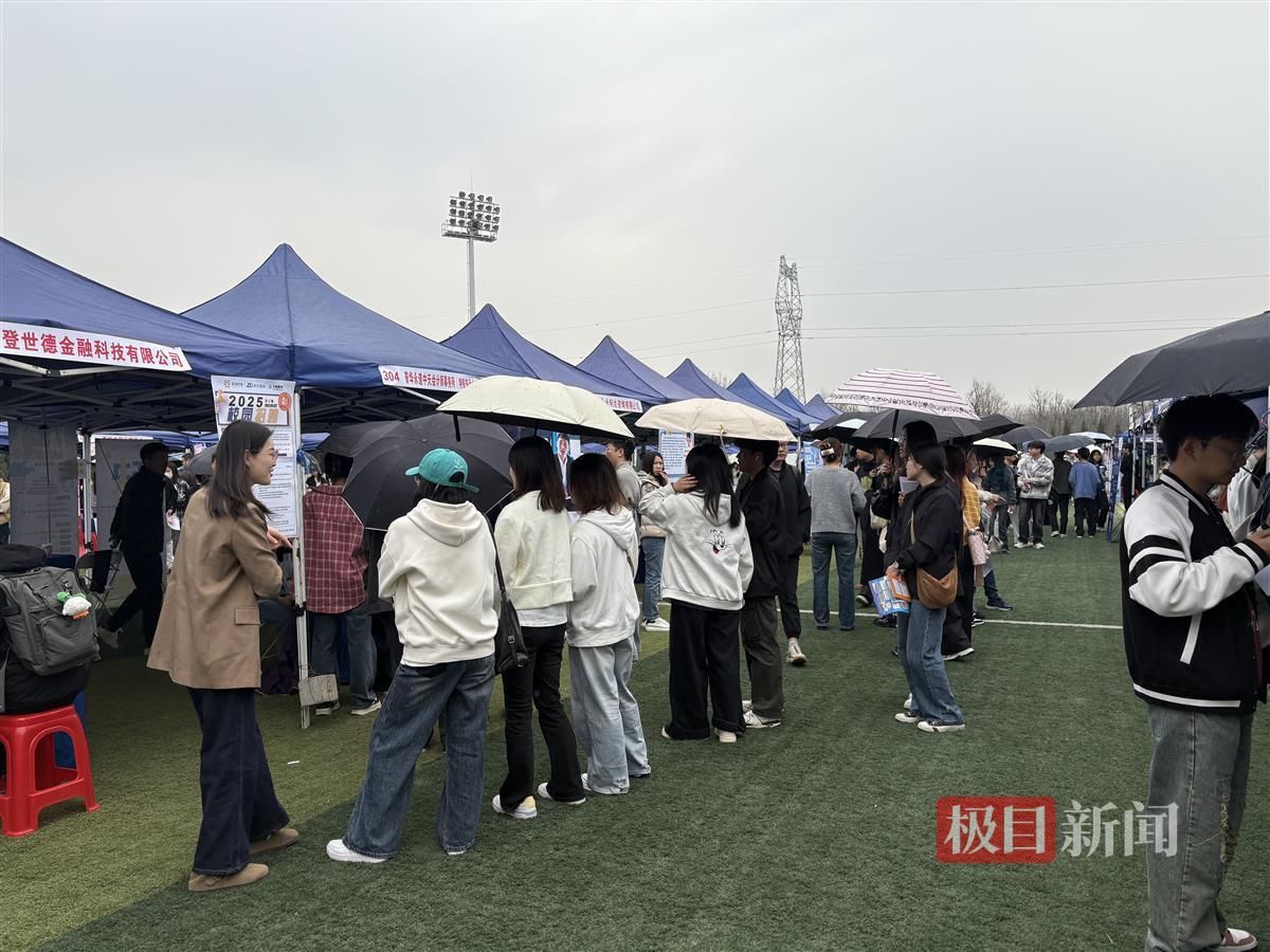 招聘会现场下着小雨,来自多所高校的毕业生打着伞,在不少展位前排起长队。