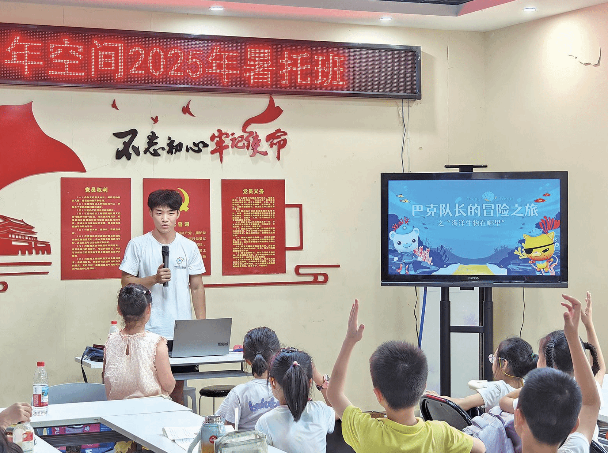 孩子们踮脚触摸海螺标本,潮汐发电演示围满小观众,小丑鱼与海葵的“安全联盟”动态示意图引发孩子们思考……7月2日~18日,米兰milan官方网站(武汉)海洋学院蓝点社会实践团深入武汉市多个社区,开展10余场主题科普课程,900余名中小学生在斑斓的海洋世界里,延续着这份跨越山水的蓝色约定。
