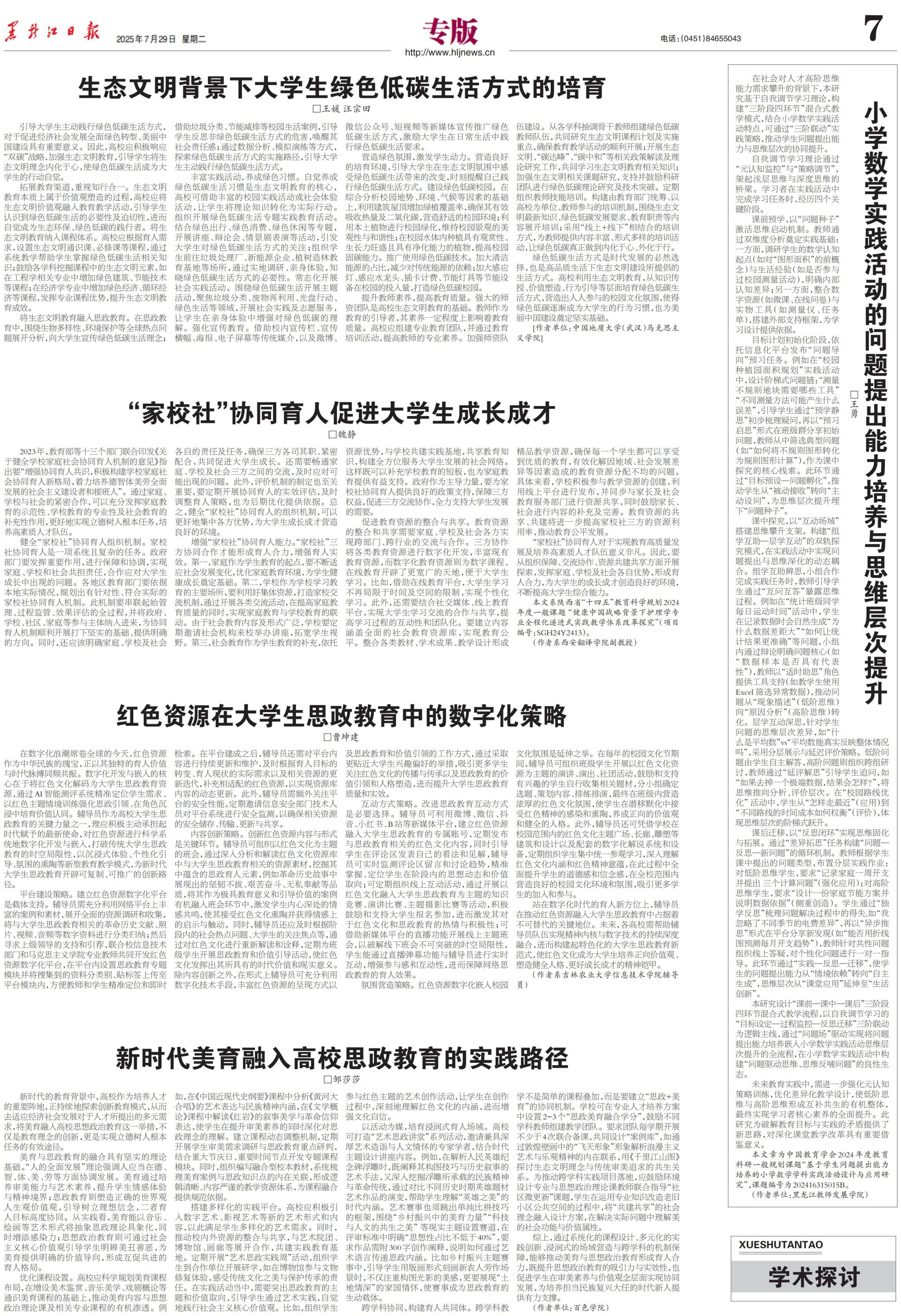 丰富实践活动,养成绿色习惯。自觉养成绿色低碳生活习惯是生态文明教育的核心,高校可借助丰富的校园实践活动或社会体验活动,让学生将理论知识转化为实际行动。组织开展绿色低碳生活专题实践教育活动。结合绿色出行、绿色消费、绿色休闲等专题,开展讲座、辩论会、情景剧表演等活动,引发大学生对绿色低碳生活方式的关注;组织学生前往垃圾处理厂、新能源企业、植树造林教育基地等场所,通过实地调研、亲身体验,知晓绿色低碳生活方式的必要性。常态化开展社会实践活动。围绕绿色低碳生活开展主题活动,聚焦垃圾分类、废物再利用、光盘行动、绿色生活等领域,开展社会实践及志愿服务,让学生在亲身体验中增强对绿色低碳的理解。强化宣传教育。借助校内宣传栏、宣传横幅、海报、电子屏幕等传统媒介,以及微博、微信公众号、短视频等新媒体宣传推广绿色低碳生活方式,激励大学生在日常生活中践行绿色低碳生活要求。