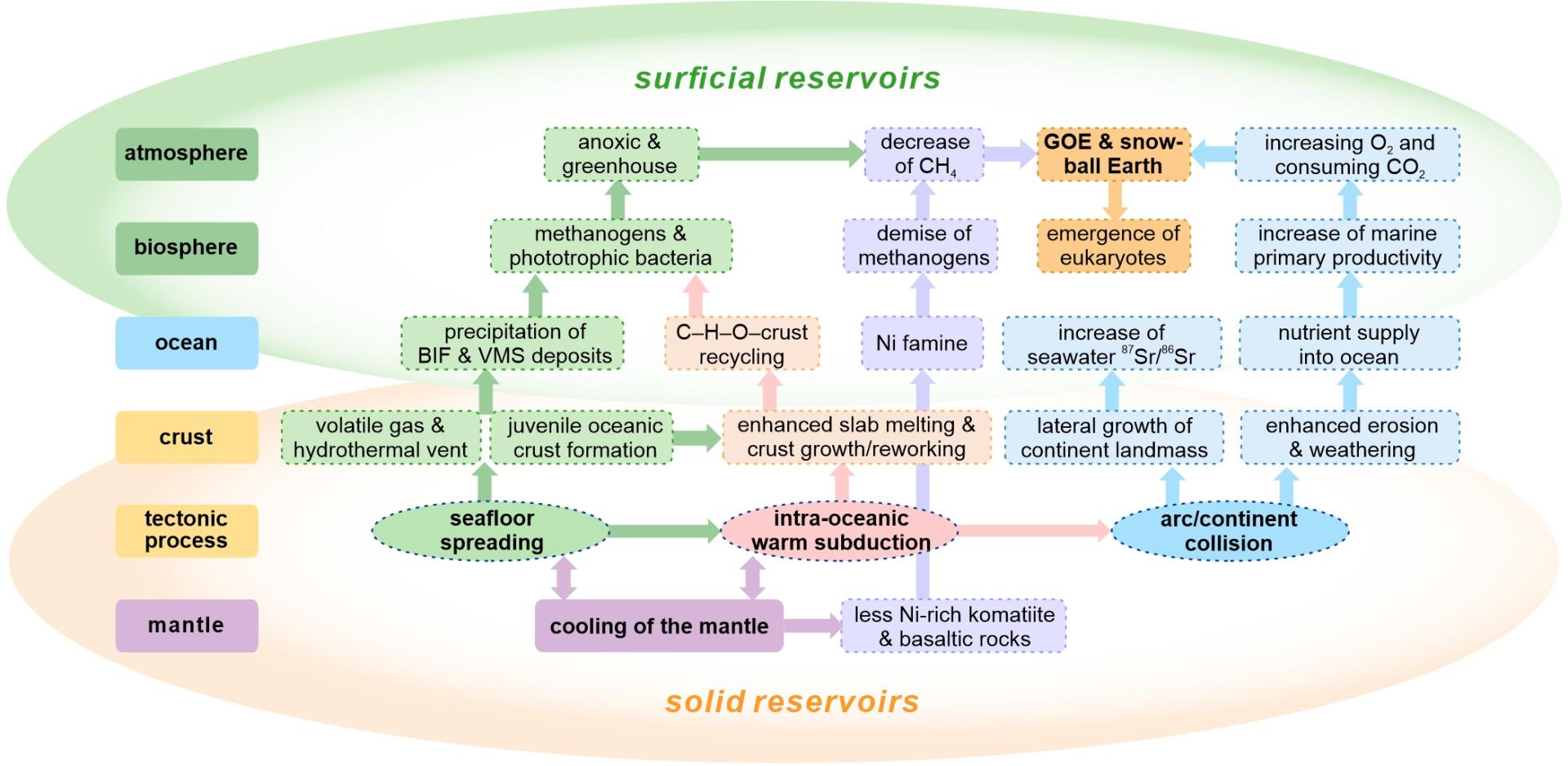 研究人员提出一个概念模型,阐述新太古代广泛发育的板块构造过程可能对太古宙—元古宙之交(25亿年前)及随后岩石圈、海洋、大气圈和生物圈演化产生的影响(图2和图3)。以洋底扩张、洋壳俯冲和弧陆碰撞等为特征的离散和汇聚板块边界地质过程促进了这一时期地幔热散失、大陆地壳垂向和侧向生长、陆壳浮出水面、BIF成矿、弧陆碰撞造山作用、陆壳风化剥蚀和二氧化碳消耗、海洋营养输入和初级生产力增加、地球增氧(GOE)和第一次雪球地球形成等重大地质、成矿和环境演变过程。该模型为理解特殊地质历史时期的板块边界过程及其资源环境效应提供了新思路。