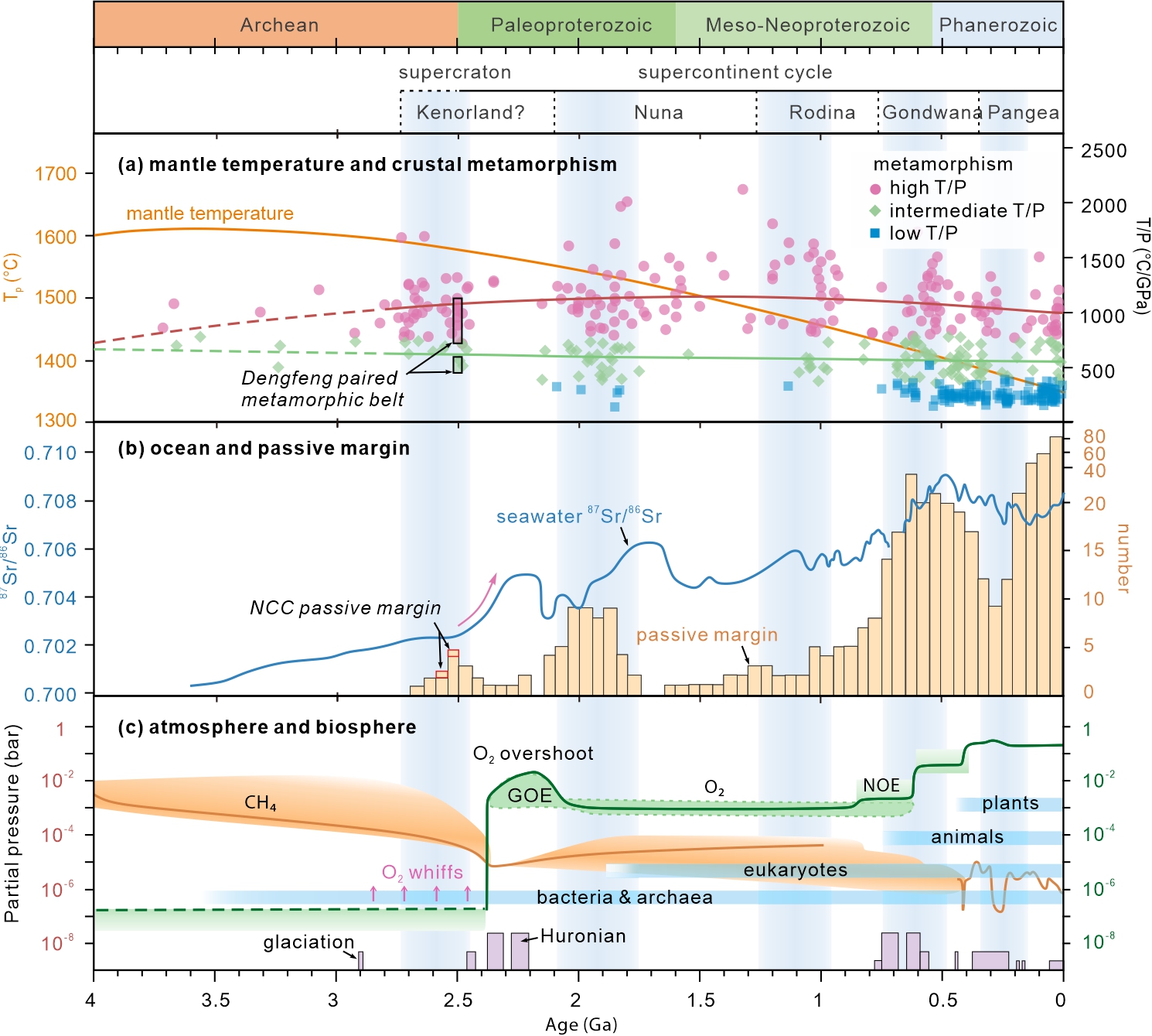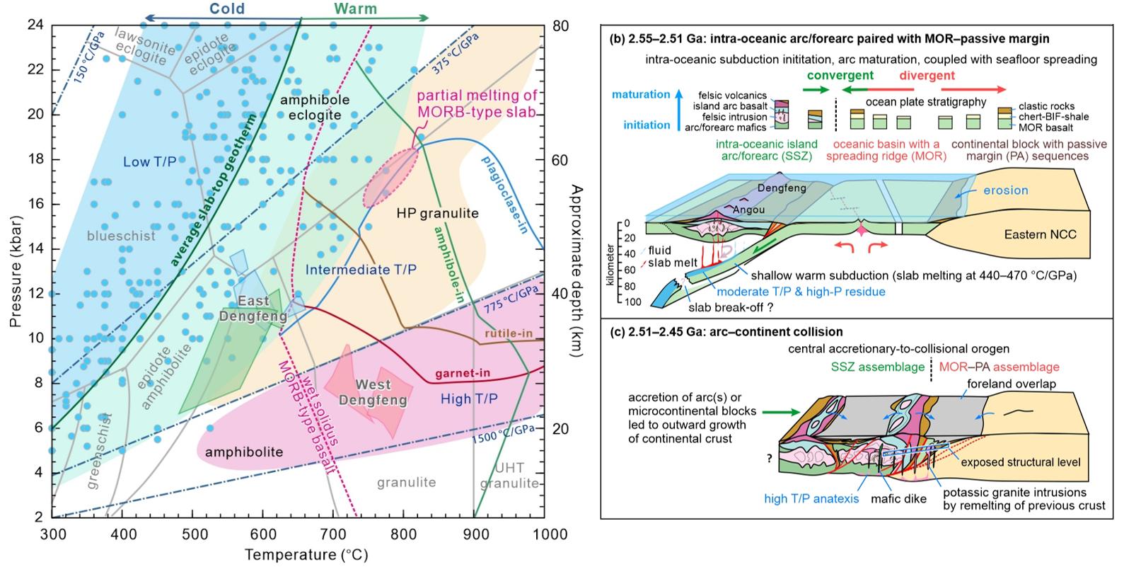 研究人员根据地球化学特征和热力学—微量元素正演模拟,提出该地区英云闪长岩—奥长花岗岩—花岗闪长岩组合(TTG)和埃达克质火山岩形成于俯冲板片部分熔融及随后的分离结晶;模拟计算显示该俯冲带拥有较高的地热梯度(440—470 °C/GPa),其与显生宙暖(热)俯冲带一致(图1)。通过太古宙末期和显生宙俯冲带和造山带样式对比,研究人员认为太古宙末期的板块构造过程与显生宙已具有一定的相似性;而以冷—深俯冲碰撞和全球性内部相连板块边界为特征的“现代样式”板块构造体制可能直到古元古代中晚期(22—19亿年前)才完全建立。
