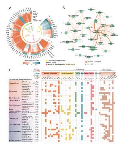 此外,BNF与硝化、硫/砷代谢、亚铁转运和甲烷氧化等过程紧密相关(图3),地下水中的有机质以及硫/铁/锰的还原过程可能是驱动微生物固氮的能量来源,而微生物固氮为相关的生物地球化学过程提供氮源。本研究从多角度证明了BNF是地下水系统重要的N循环环节,完善了我们对地下水N循环的认识,对深入理解相关生物地球化学过程具有重要意义。