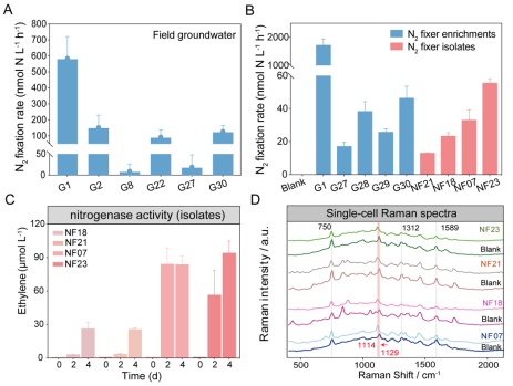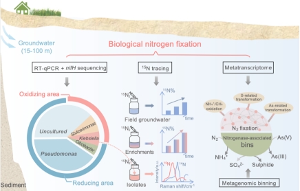 生物固氮(BNF)是将N2转化为生物可利用N的过程,在维持全球N循环中具有重要作用。地下水是重要的淡水资源,农业灌溉和生活污水的排放向地下水输入了大量的N,加速了地下水中NH4+和NOX-的转化。然而,目前学界对地下水系统中的BNF过程仍知之甚少。本研究采用15N2同位素示踪、单细胞拉曼以及宏基因组/转录组等技术,通过原位表征并结合室内验证,发现了地下水系统中存在大量有活性的固氮微生物。