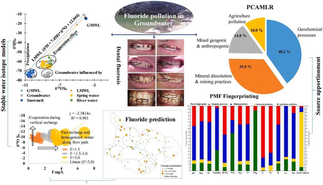 论文系统采收集了96个不同来源的地下水、地表水和岩石样本,通过水文地球化学、稳定同位素、结合矩阵分解(PMF)、主成分分析多元线性回归模型(PCAMLR)技术,综合评估了巴基斯坦吉尔吉特半干旱地区高氟地下水的成因、污染来源以及人体健康风险。研究发现,该地区地下水氟含量严重超标不宜饮用,高氟水产生的主要物源包括水文地质过程、采矿活动、工业生产及农业污染,并建议以上四方面切入点,为解决高氟地下水健康威胁提供针对性的治理策略。