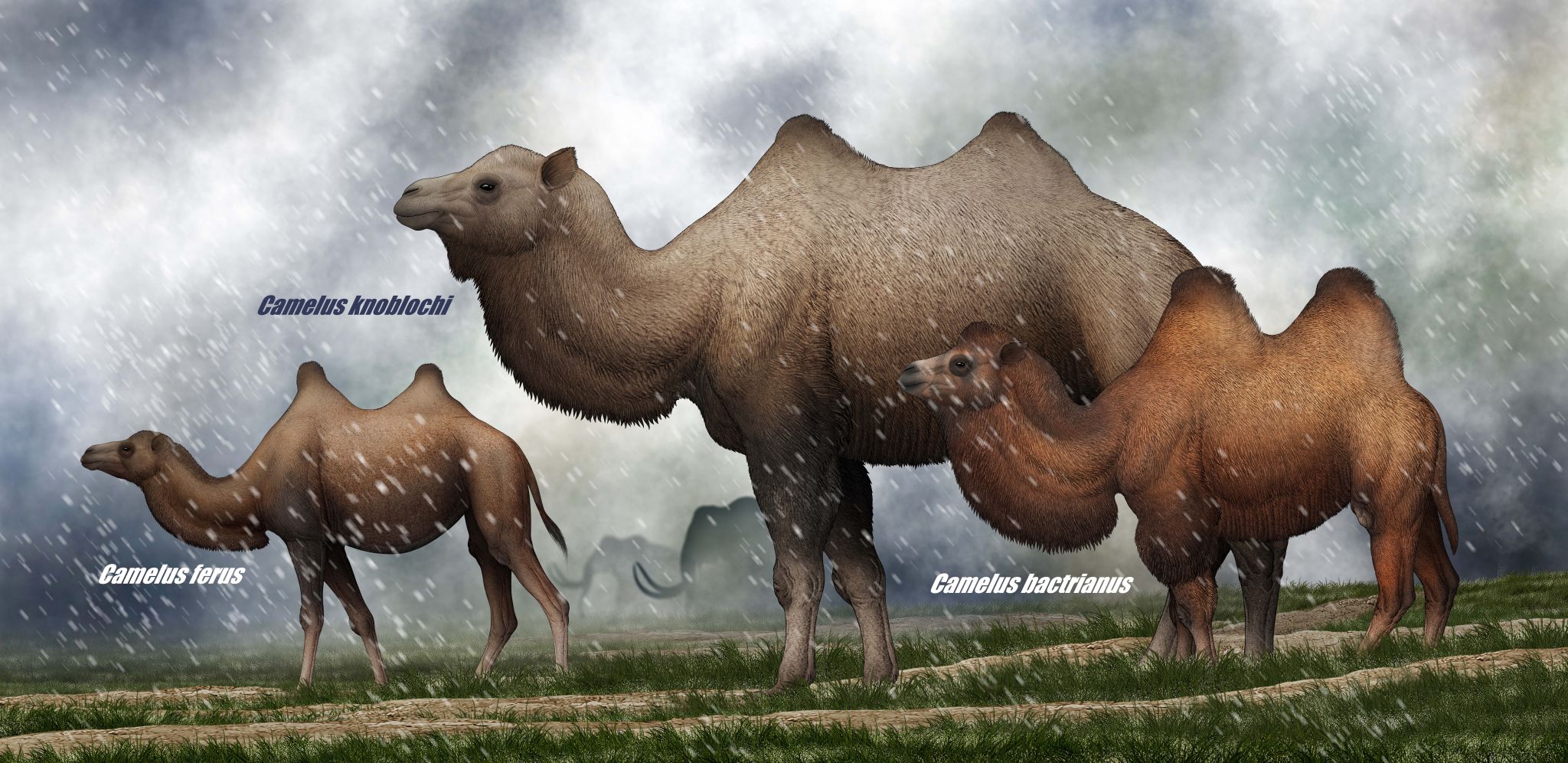 灭绝种诺氏驼复原图(中)与现生种野双峰驼(左)和家双峰驼(右),陈瑜(菊石君)绘