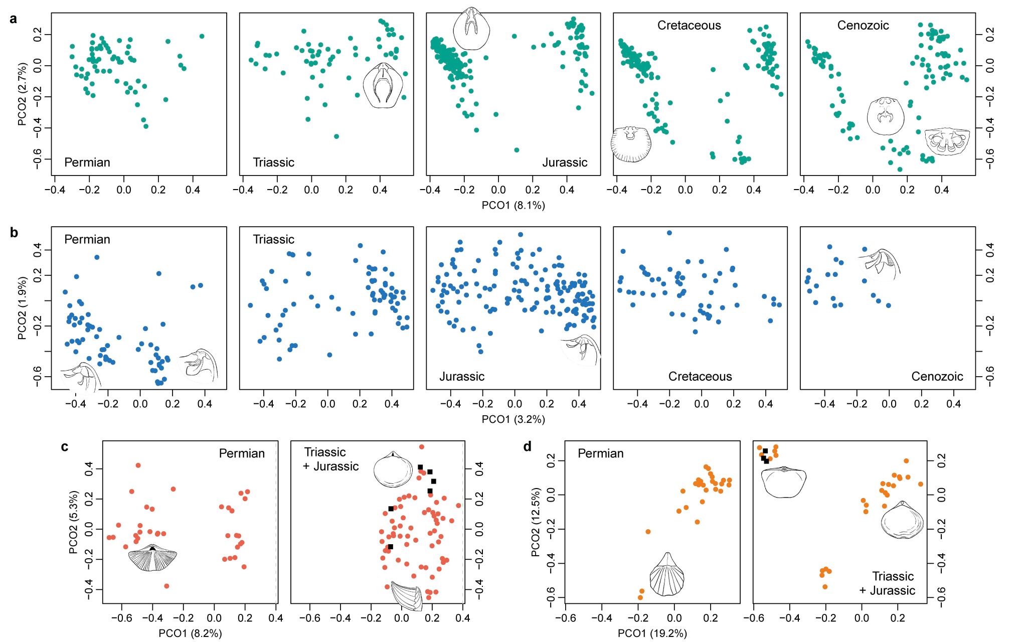 研究发现,这四个目的形态差异度变化有不同的趋势,但都在中生代早期恢复到了二叠纪末大灭绝之前的水平(图2)。此外,这四个腕足目的形态空间分布模式也不尽相同,但它们都在中生代扩展了其形态空间,展现出预料之外的形态创新能力以及对中—新生代环境的适应(图3,图4)。