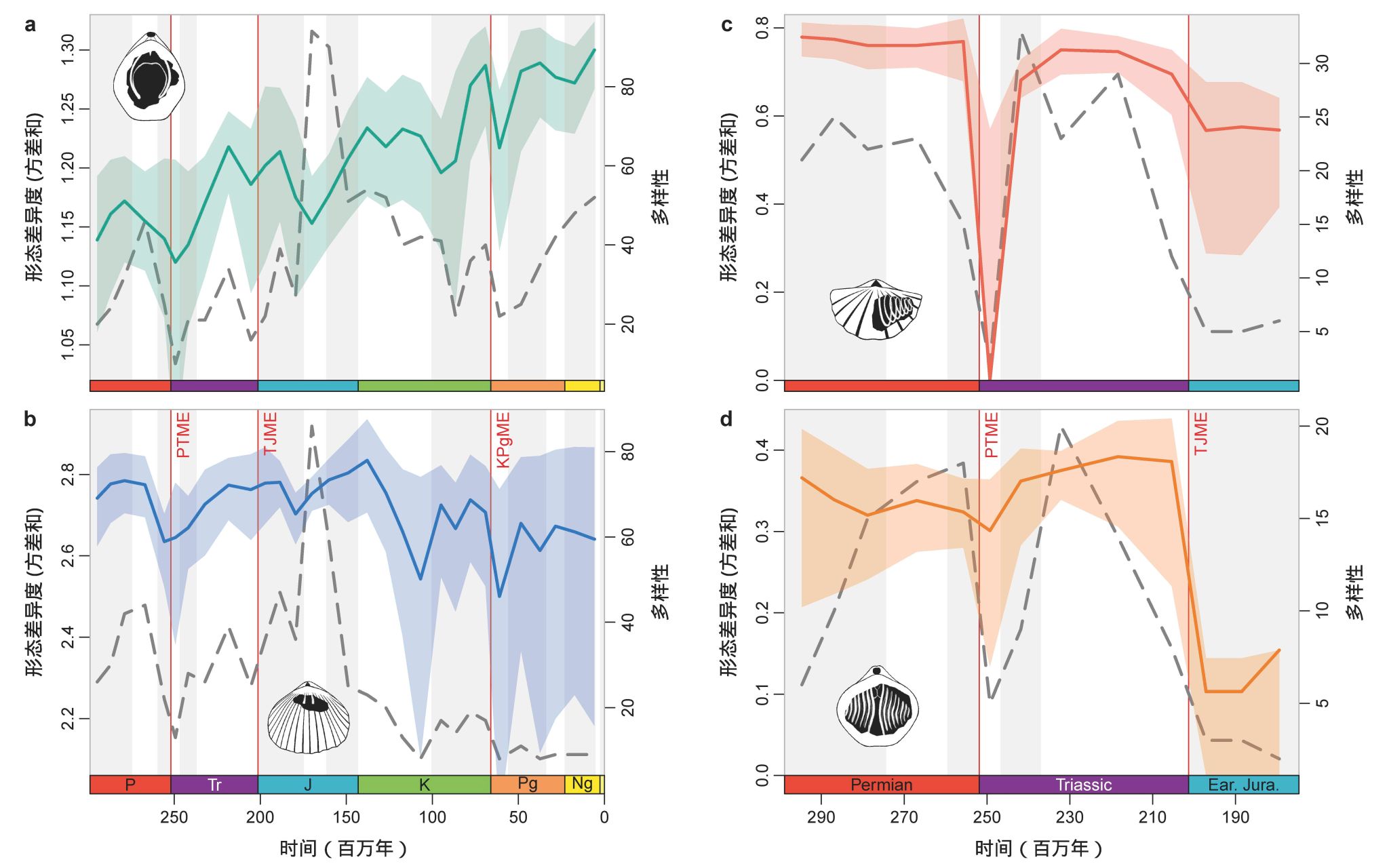 本研究还对比了三次大灭绝事件(二叠纪末大灭绝、三叠纪末大灭绝、白垩纪末大灭绝)对腕足动物形态演化的影响,发现不同类群在不同灭绝事件中的表现有很大差异,揭示了大灭绝事件对生物影响的异质性和复杂性。
