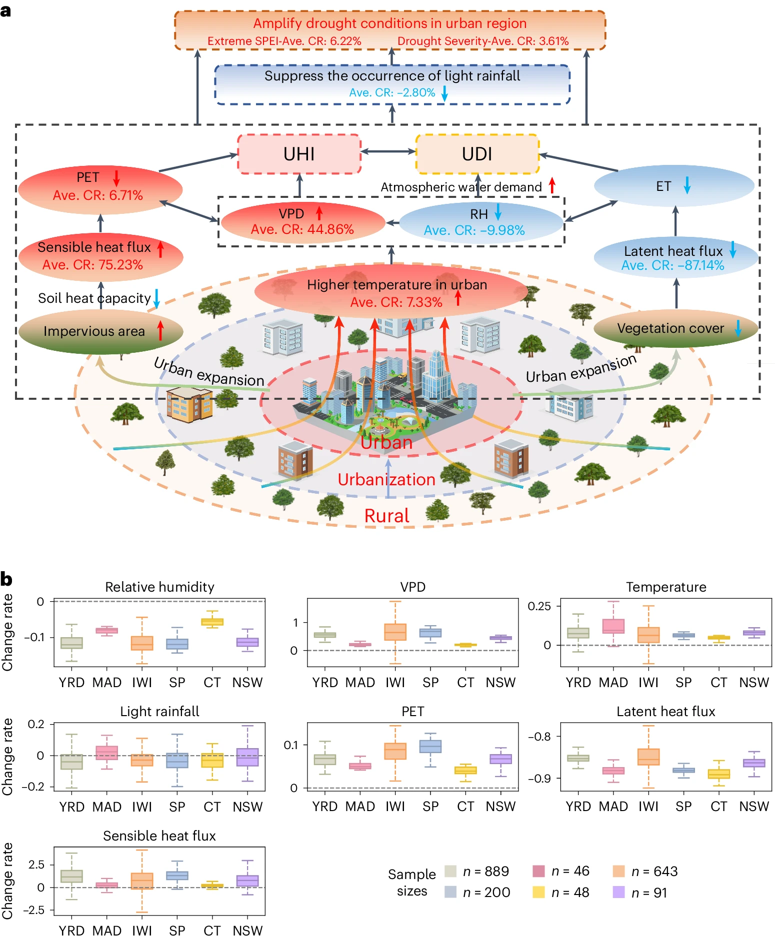 本研究通过对城市化与局地干旱的关联的全面分析,定量揭示了城市化影响下极端干旱的加剧,并探讨了潜在机制。随着城市扩展和人口增长的持续,这些发现将增强对城市化在局地干旱发生发展过程中的作用的理解,为城市干旱的防灾减灾以及城市可持续发展提供理论支撑。