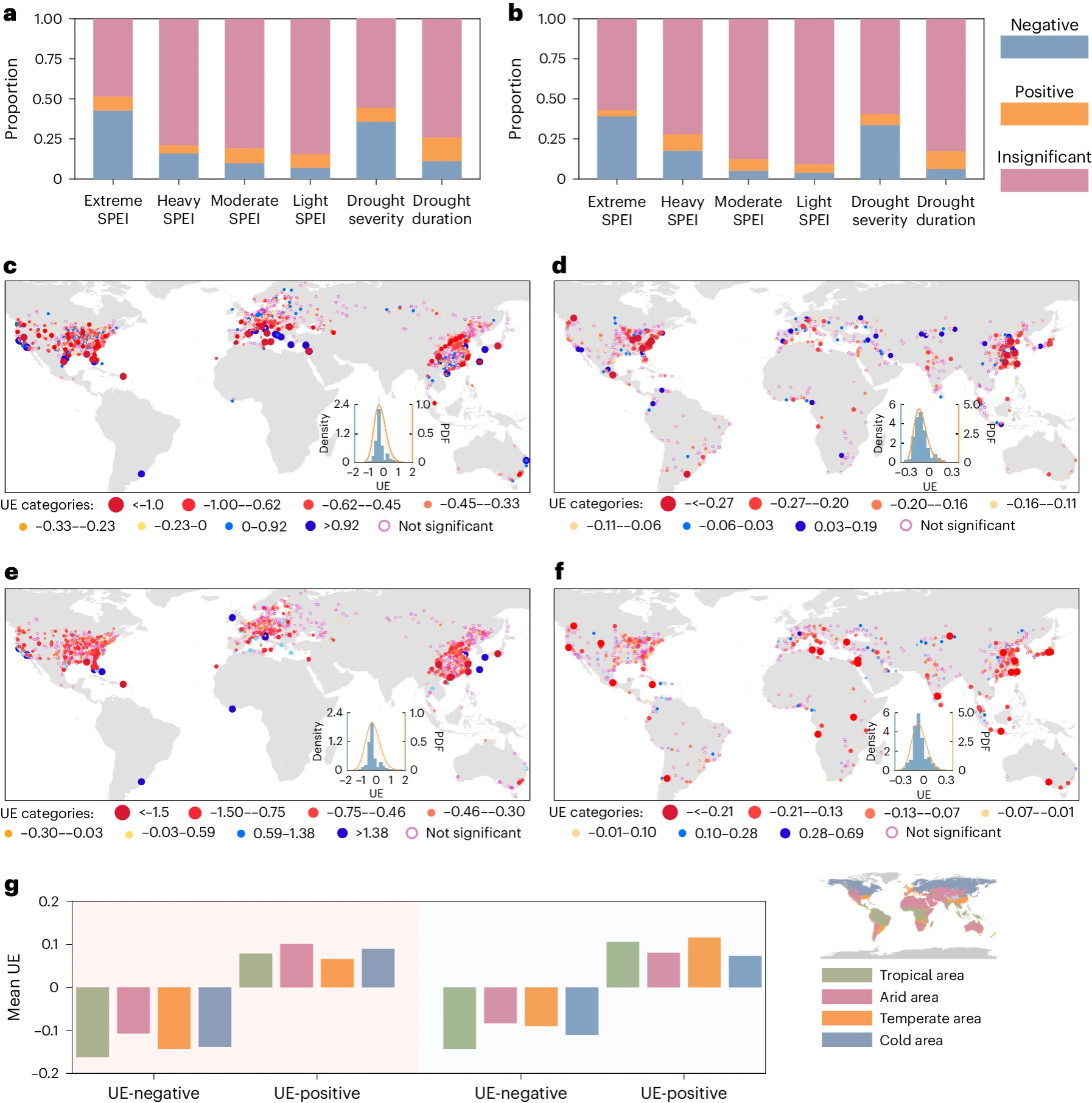 图1 全球城市化对不同局地干旱指标的影响及分布