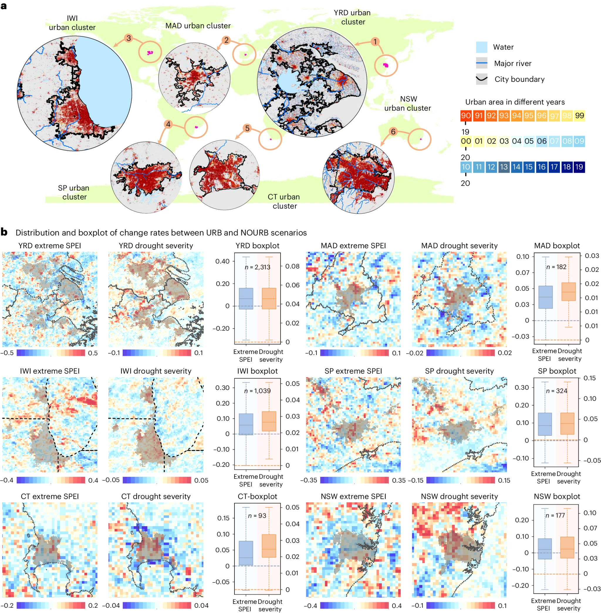 地大新闻网讯 (通讯员 王思琪)近日,由米兰国家地理信息系统工程技术研究中心陈能成教授带领的智慧地球团队与国内外合作者,在《自然》(Nature)子刊《自然·城市》(Nature Cities)发表题为《全球范围城市化导致的极端干旱加剧》的学术论文,定量揭示了全球城市化对局地极端干旱加剧的影响。论文第一作者为该团队2022级博士生黄舒哲,通讯作者为陈能成教授与武汉大学测绘遥感信息工程国家重点实验室王超副教授。同期,《自然》杂志特邀作者在Nature Research Briefing专栏以题为《城市化加剧了全球几乎一半城市的极端干旱》,在线报道了该研究成果。