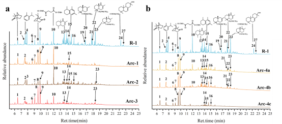 图4 通过Py-GC/MS分析的不同时期出土琥珀制品的总离子色谱图