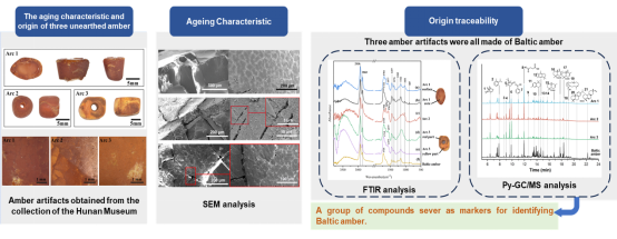 中国的琥珀艺术距今至少已有三四千年的历史,关系着古代中西方贸易往来及文化的交流融合,因而对出土琥珀文物进行产地溯源具有重要的历史文化意义。同时,为科学、持久地保存琥珀文物,最大限度地延缓琥珀文物在埋藏和保存过程中发生的劣化,亟需对出土琥珀的老化特征进行识别并厘清其老化降解机理。研究团队采用傅里叶变换红外光谱(FTIR)、扫描电子显微镜(SEM)和热裂解气相色谱质谱(Py-GC/MS)等对中国宋、明、清三个时期出土的多件琥珀制品进行了溯源及老化特征研究,探索了琥珀制品的自然老化机理。