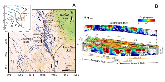 图1.安宁河-则木河断裂构造背景图(A)和反演的断层精细闭锁率分布(B)。图A中黑线表示区域活动构造断裂,蓝色箭头表示GNSS速度场。图B表示反演得到的断层闭锁率分布,从蓝色到红色表示断层闭锁程度逐渐增加。