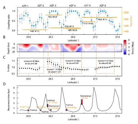 图 2. 图A表示平均断层闭锁率沿走向的变化,橙色线段表示历史地震破裂范围(Wen et al.,2008). 图B和C表示自上次强震发生后至今积累的剪切应力与b值的比较。图D表示根据断层闭锁率和破裂动力学理论估算的地震复发周期(黑线)与地震地质探槽结果(红色条棒)之间的对比。