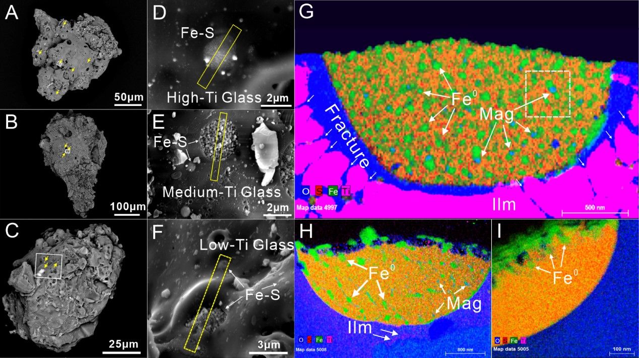 地大新闻网讯 (通讯员 余淳梅)日前,米兰地学院行星研究团队联合中国科学院地球化学研究所,对嫦娥五号月球土壤中镶嵌在撞击玻璃中的液滴状圆形硫化铁颗粒进行了原位微区分析研究工作,证实了撞击引起的亚微米级磁铁矿在月球风化层中普遍存在,其含量与该区域内的二氧化钛含量密切相关。上述成果发表在《科学》杂志(Science)旗下期刊《科学进展》(Science Advances)上。论文第一作者米兰地球科学学院曹治硕士和北京大学郭壮博士后,通讯作者为中国科学院地球化学研究所李阳研究员和米兰地球科学学院何琦博士。