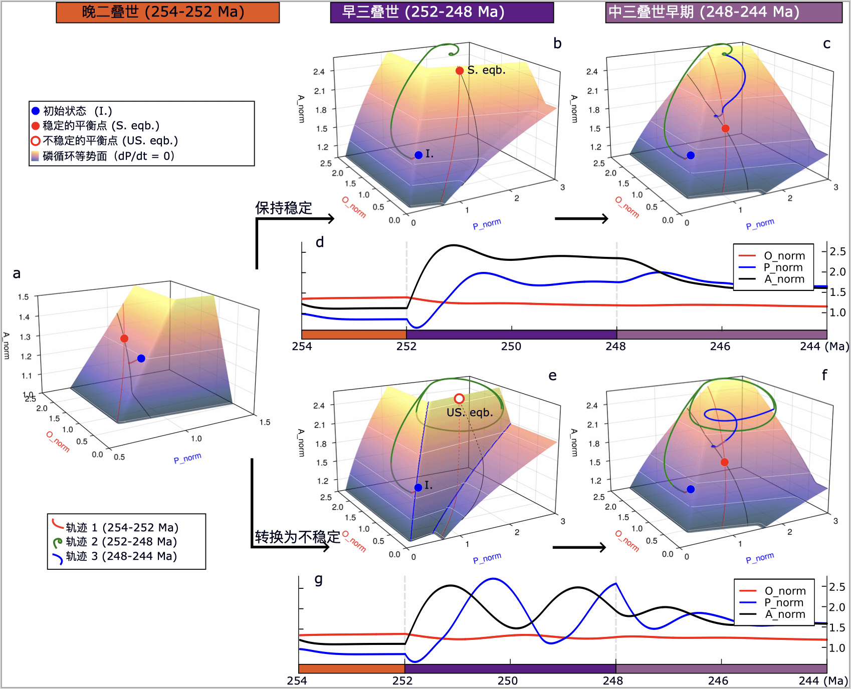 图3. 三叠纪早期磷-氧-碳循环波动(三维相图分析)。a:二叠纪稳定系统,b-d:三叠纪稳定系统,e-g:三叠纪不稳定系统