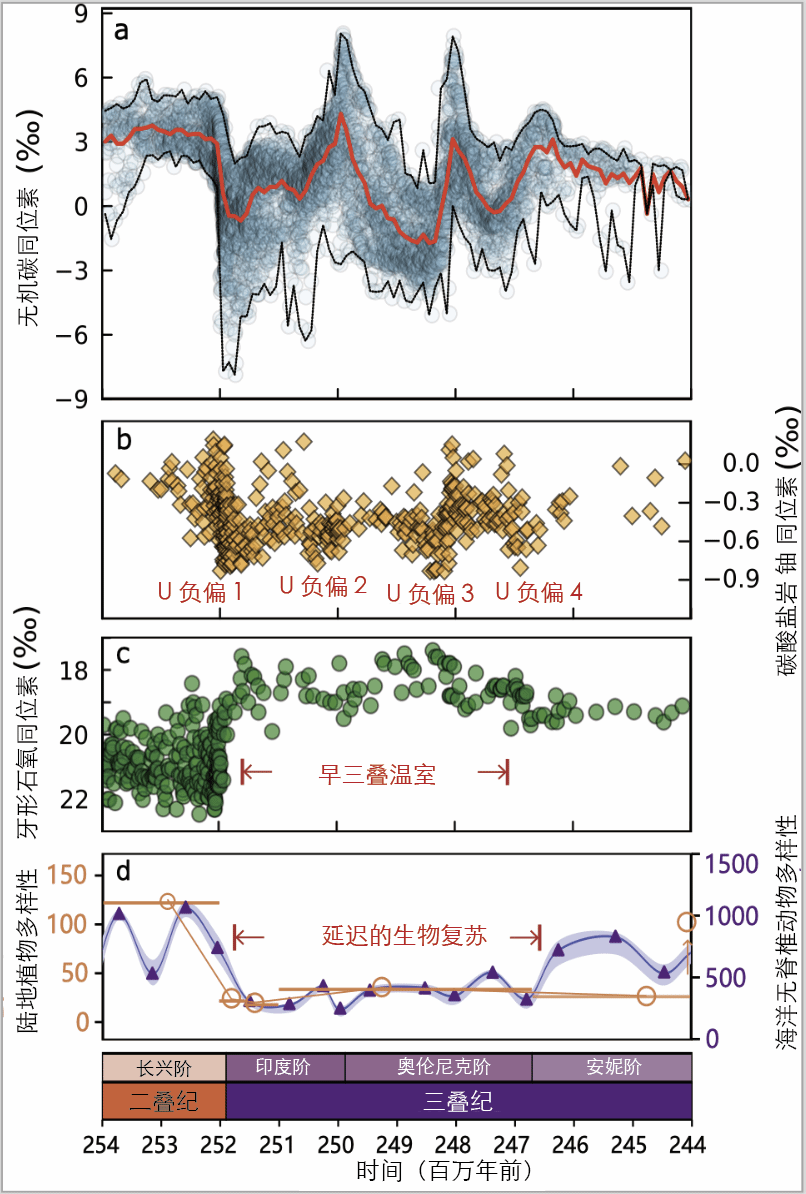 图1.二叠纪大灭绝后显著的生物地球化学循环波动与延迟的生物复苏,图为由同位素地球化学指标(比如无机碳同位素、牙形石氧同位素,碳酸盐岩铀同位素等)表达的多种环境因子出现长达600万年剧烈震荡时期。