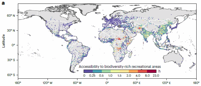 图1.世界城市到生物多样性丰富休闲区的可及性(以旅行时间衡量)