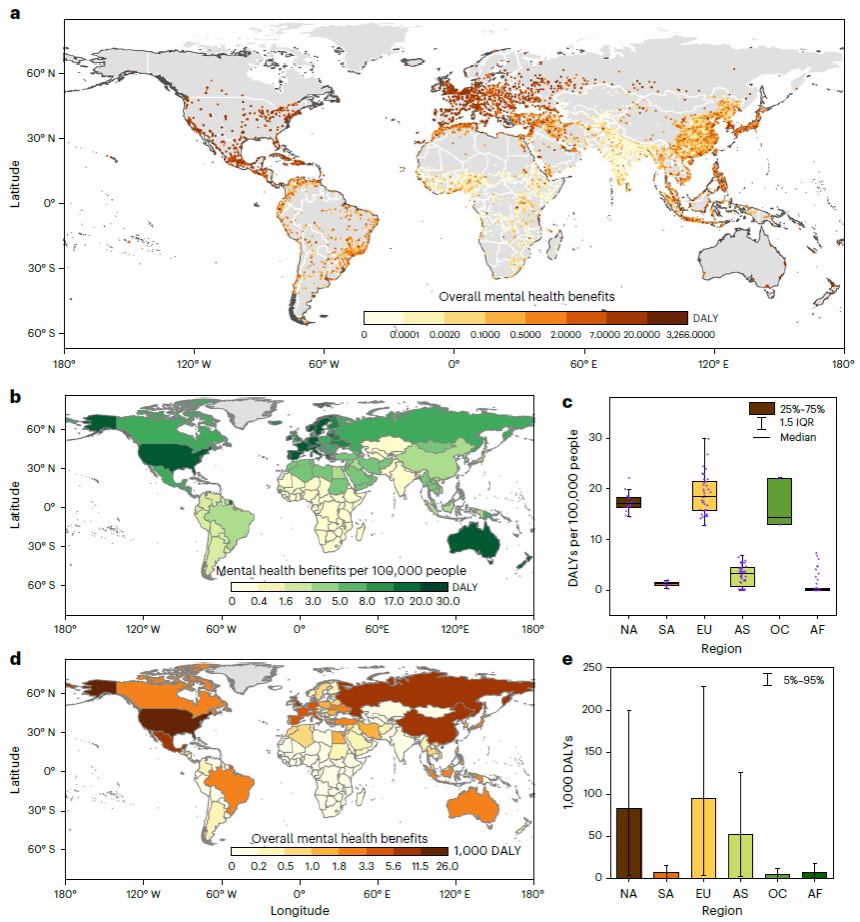 研究发现,到生物多样性丰富休闲区的旅行成本和经济负担在全球分布的非均衡性,欧洲、大洋洲和北美洲城市的经济可承受性和访问率最高(图2)。生物多样性丰富的休闲区在减少抑郁症和焦虑症方面具有可观的效益,在欧洲、北美洲和南美洲的发达地区,具有良好的成本效益(图3和图4)。