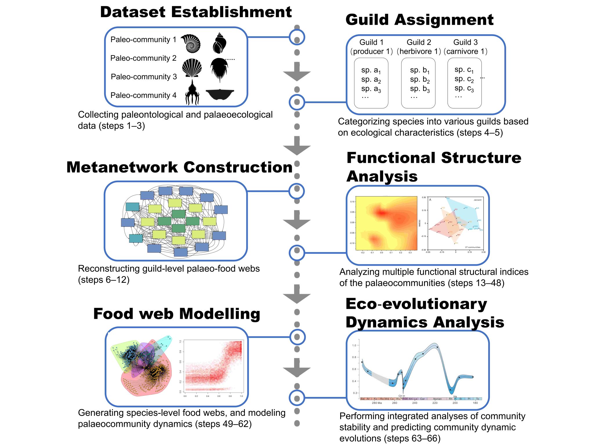 该模拟方法的核心在于通过系统的步骤(图2)解析深时生态系统的奥秘,不仅解决了古食物网重建与古群落动态定量评估的难题,而且通过生态数值模拟古食物网的生态扰动,如初级生产者减少或顶级捕食者灭绝等情况,揭示次级灭绝的发生机制,进而确定生态系统的崩溃阈值与稳定性指标。
