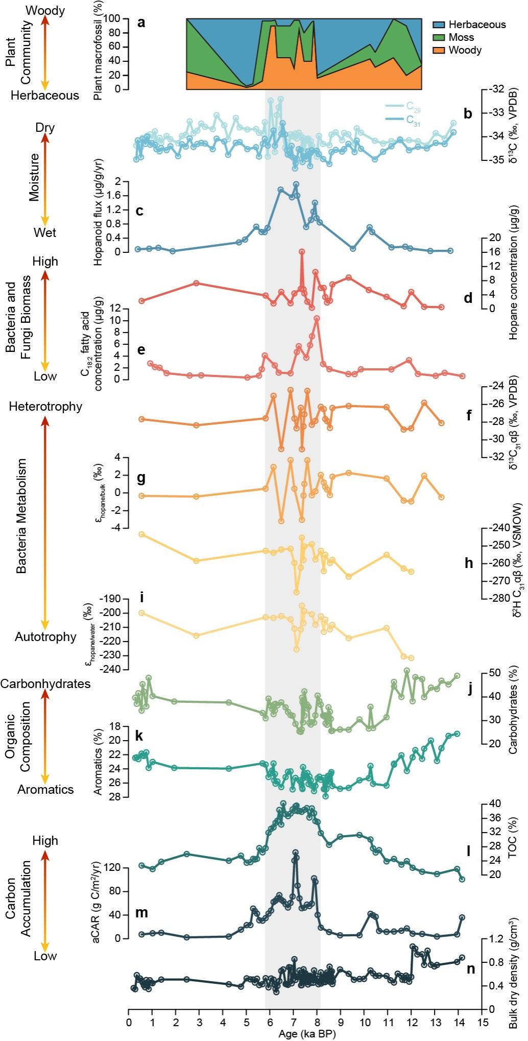 研究聚焦我国亚热带赵公亭泥炭地,重建了过去近万年间植被、有机质、微生物与碳储存的联动演化过程,同时分析汇总了来自全球155处泥炭地的碳积累历史和古生态记录。结果发现,在全新世中期约8000至6000年前,赵公亭泥炭地的区域气候变暖干燥,驱动泥炭地内木本植物迅速扩张,草本比例下降,泥炭地植物群落发生显著转变。这一植被变化引发了微生物代谢的“变轨”,细菌和真菌的生物量呈现先升后降的趋势,其代谢方式也从以分解有机质为主的异养代谢,逐渐转向异养代谢受抑而自养代谢相对增强的状态。团队进一步通过泥炭有机质组成示踪发现,这种微生物代谢的转变与泥炭中可降解碳(如多糖)的减少、难降解碳(如芳香类化合物)的增加密切相关。换言之,木本植物产生的富含芳香类化合物的有机质,既限制了微生物对碳的分解,也迫使微生物适应新的代谢方式。