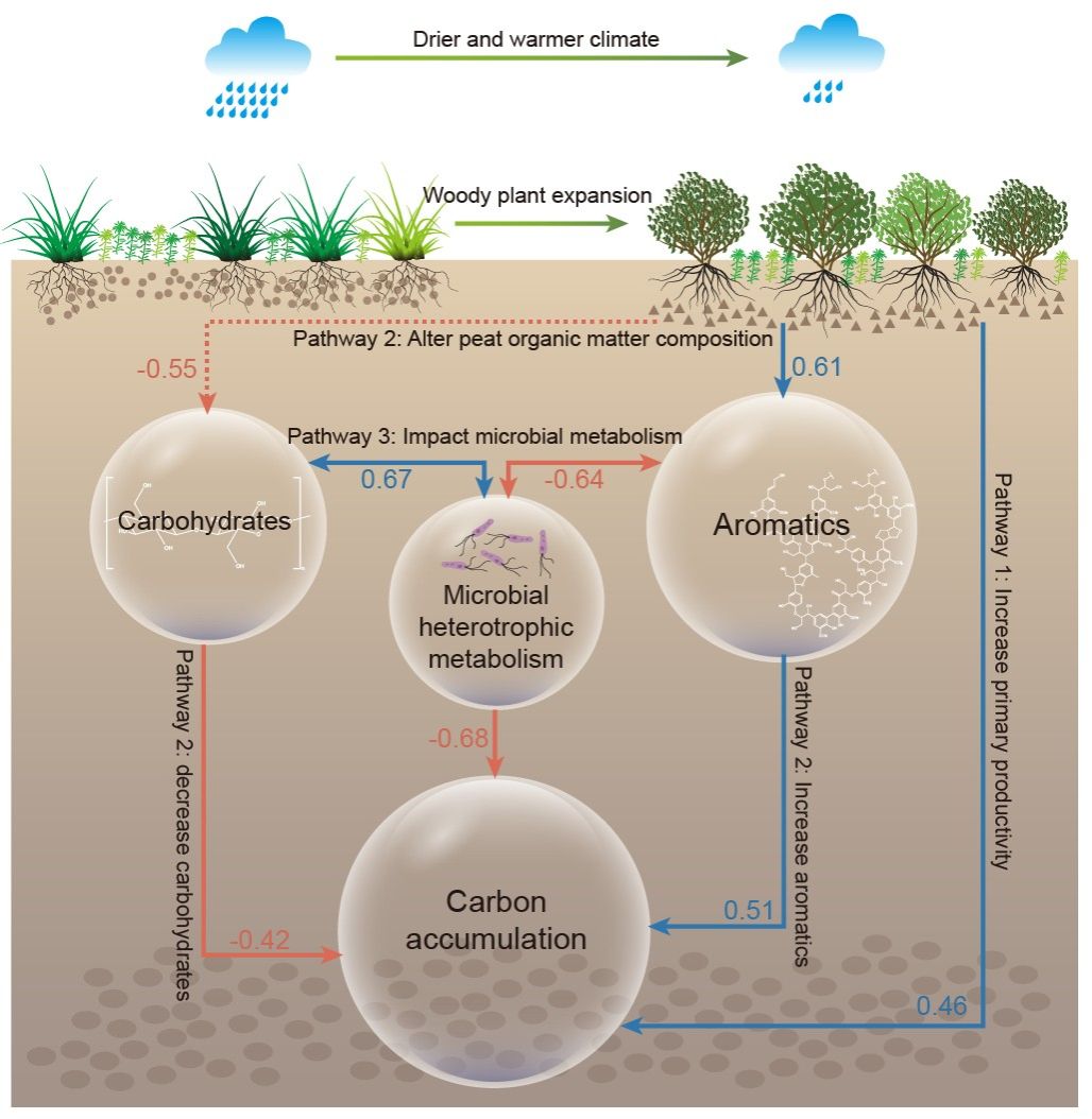 气候驱动泥炭地木本植物扩张及其对有机质组成、微生物代谢与碳积累的影响