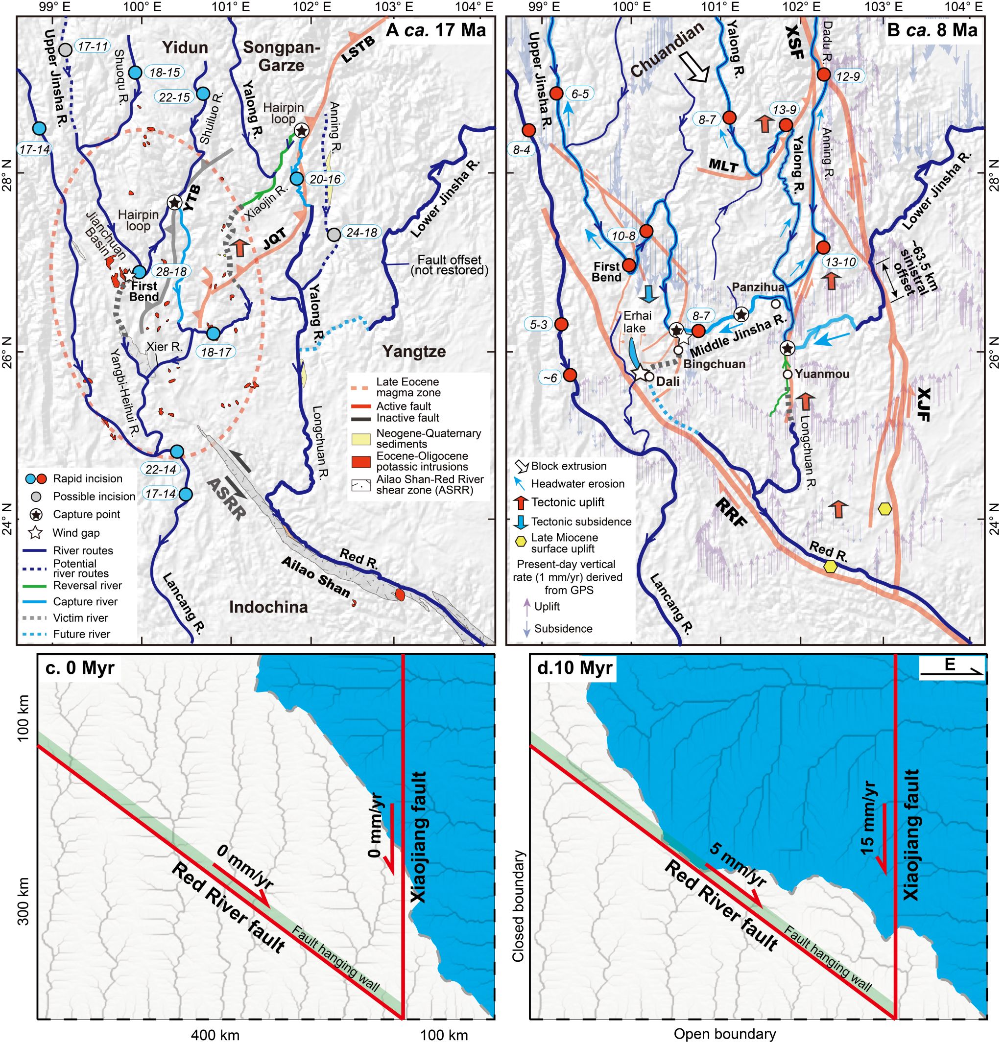 长江是世界第三长河,亚洲第一大河,发源于青藏高原,东流汇入太平洋。长江为何东流,何时贯通入海仍是百年谜题,长江是否曾经汇入红河流入南海仍存在巨大争议。该研究聚焦于长江上游和红河中游地区,开展了河流下蚀历史和沉积物物源示踪的互补研究,重建了青藏高原东南部古水系路径的演化过程。一方面,通过低温热年代学恢复了金沙江中游干流河谷的下蚀历史,揭示18-17 Ma和8-7 Ma两期河流快速下切。金沙江中游中新世早中期的河流快速下切与金沙江上游和澜沧江具有准同时性,指示金沙江中上游很可能与澜沧江连通形成南流水系。另一方面,通过对红河中游晚新生代盆地中的河流沉积物的碎屑矿物年代学和热年代学的物源示踪,指示中新世早中期的红河未曾与金沙江上游发生关联,而是与雅砻江连通形成另外一条南流水系。据此,重建了青藏高原东南部中新世早中期两条近平行的南流古金沙江和古红河。金沙江中游中新世中晚期的河流快速下蚀具有从下游(13-9 Ma)向上游(6-5 Ma)迁移的规律,指示河流溯源侵蚀依次袭夺南流水系,贯通形成东流长江,这一水系重组过程也被红河中游沉积物源变化所记录。地貌模拟验证晚新生代大型走滑断裂活动可以引起大陆尺度的地貌变化,驱动河流向西溯源侵蚀袭夺南流水系,最终形成类似于现今青藏高原东南部的水系格局。