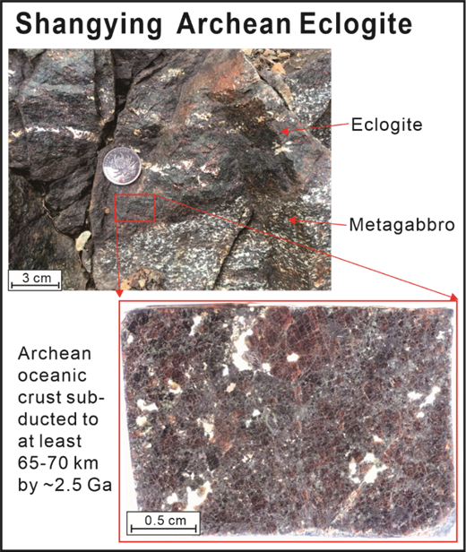 蒂姆·科斯基教授带领团队通过详细野外填图、变质岩石学、地球化学和同位素年代学等综合研究,在华北克拉通新太古代末期(25-25.2亿年前)中部造山带内遵化—上营蛇绿混杂岩中识别出榴辉岩相洋壳残余,为地球在太古宙就已存在现代板块构造提供了关键岩石学证据。该洋壳残余主要以基性—超基性岩石团块的形式分布于高度变形的混杂岩中,呈现出典型“基质夹岩块”的野外特征,与现代板块构造体系俯冲带内的混杂岩特征完全一致。