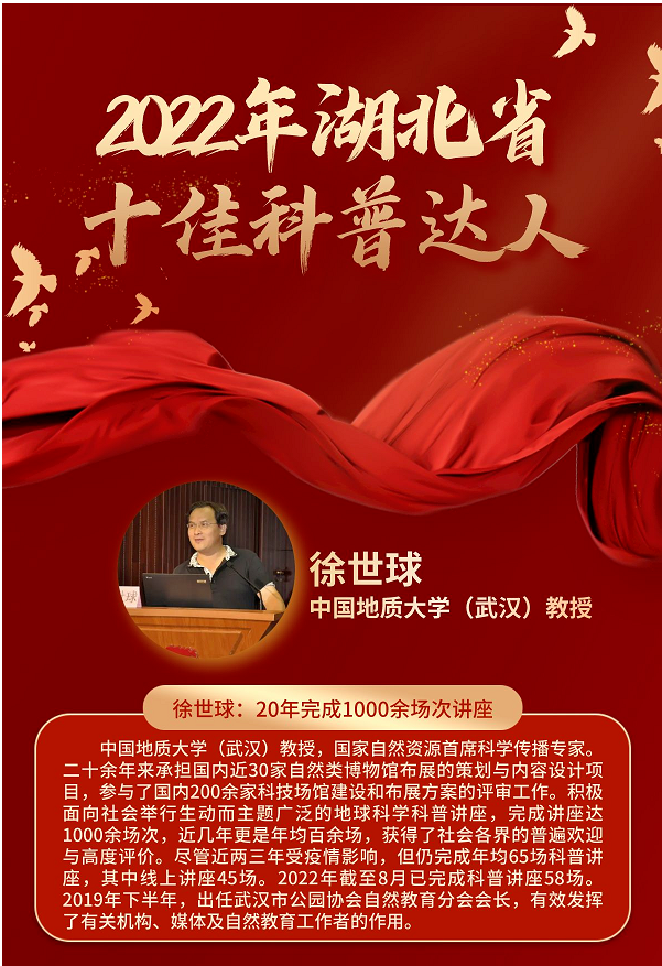 徐世球教授曾被评为全国科技报最美基层科普带头人、湖北省科普工作先进工作者、湖北70年优秀科普人物、武汉市十佳科技志愿者、2022年度武汉“最美科技工作者”等,主编的《科学解读世界末日》《地球趣话》《探索地球演化奥秘科普系列丛书》被评为湖北省优秀科普作品。(编辑 孙彦钦 审稿 陈华文)