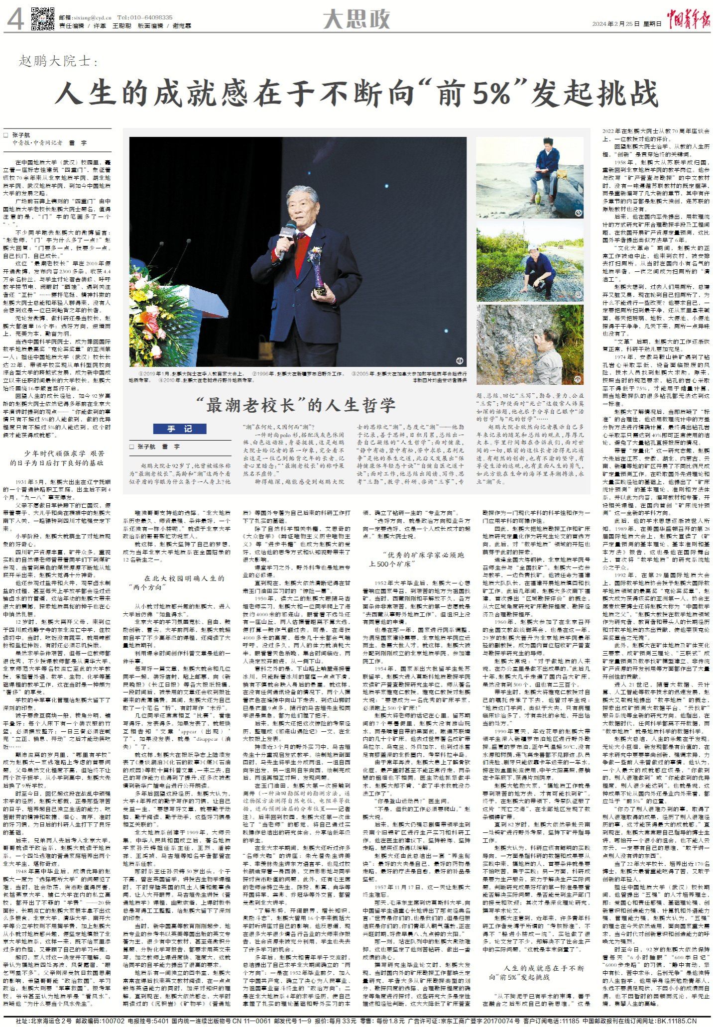 编者按:2月25日,《中国青年报》以《赵鹏大院士:人生的成就感在于不断向“前5%”发起挑战》为题,整版报道米兰赵鹏大院士的奋斗故事,勉励青年人学无止境,勇攀人生的高峰,原文如下: