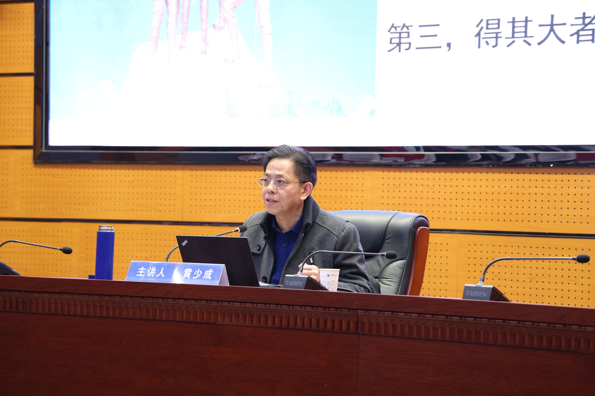 黄少成以《坚定中国特色社会主义理想信念,努力做时代的“攀登者”》为题作报告。他结合一系列数据和案例,从历史维度系统阐释中国特色社会主义形成的必然逻辑,从发展维度全面概括改革开放40余年中国特色社会主义取得的伟大成效,从治理维度深刻解读中国特色社会主义的制度优势,引导参训学员不断坚定中国特色社会主义理想信念。他激励青年学生立鸿鹄之志、崇德修身、敢于担当、知行合一,不断弘扬校训精神,争做品德高尚、基础厚实、专业精深、知行合一的创新人才,为强国建设贡献青春力量。