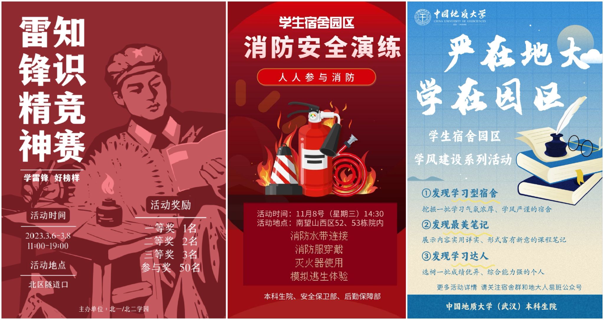 为进一步强化学生对所在学园的归属感,近年来,学校在常规工作的基础上探索组织了“学园主题活动月”。按照“一月一主题、一月一总结,一月一展示”的工作思路,结合时事热点和重要时间节点,定期在学生宿舍园区内开展国家安全、消防安全、防范电信网络诈骗等系列安全教育活动和雷锋大讲堂、园区运动会、宿舍大扫除、美术作品征集等五育活动,营造文明宿舍建设良好氛围。