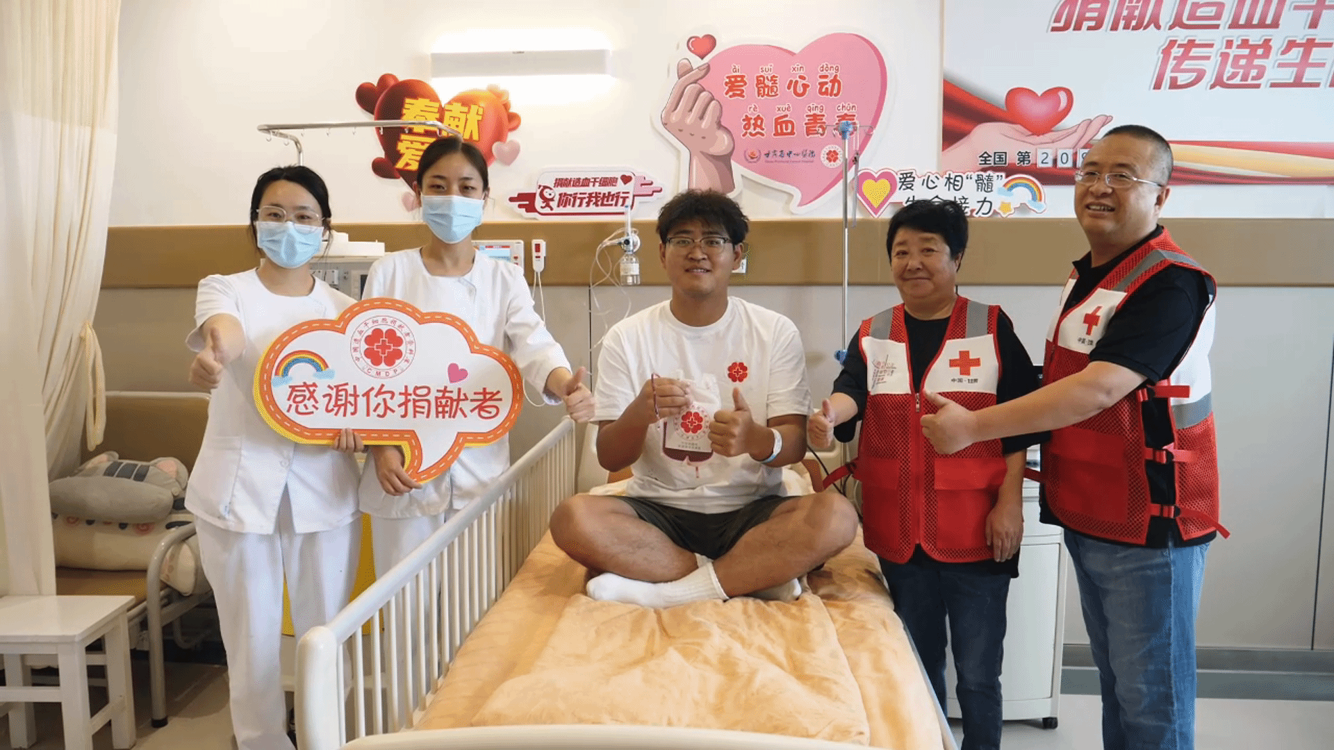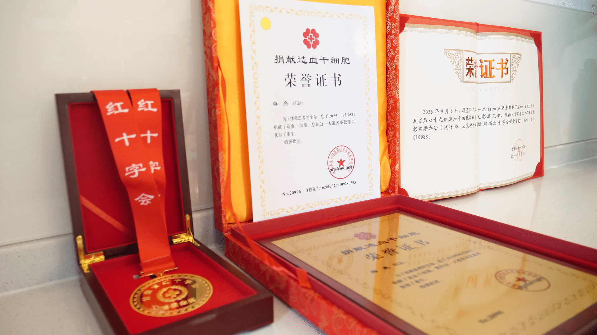 捐献当天,甘肃省红十字人道事务服务中心主任张雅文专程来到医院,看望正在采集的蒋亮,为他颁发“博爱金奖”奖牌和荣誉证书。