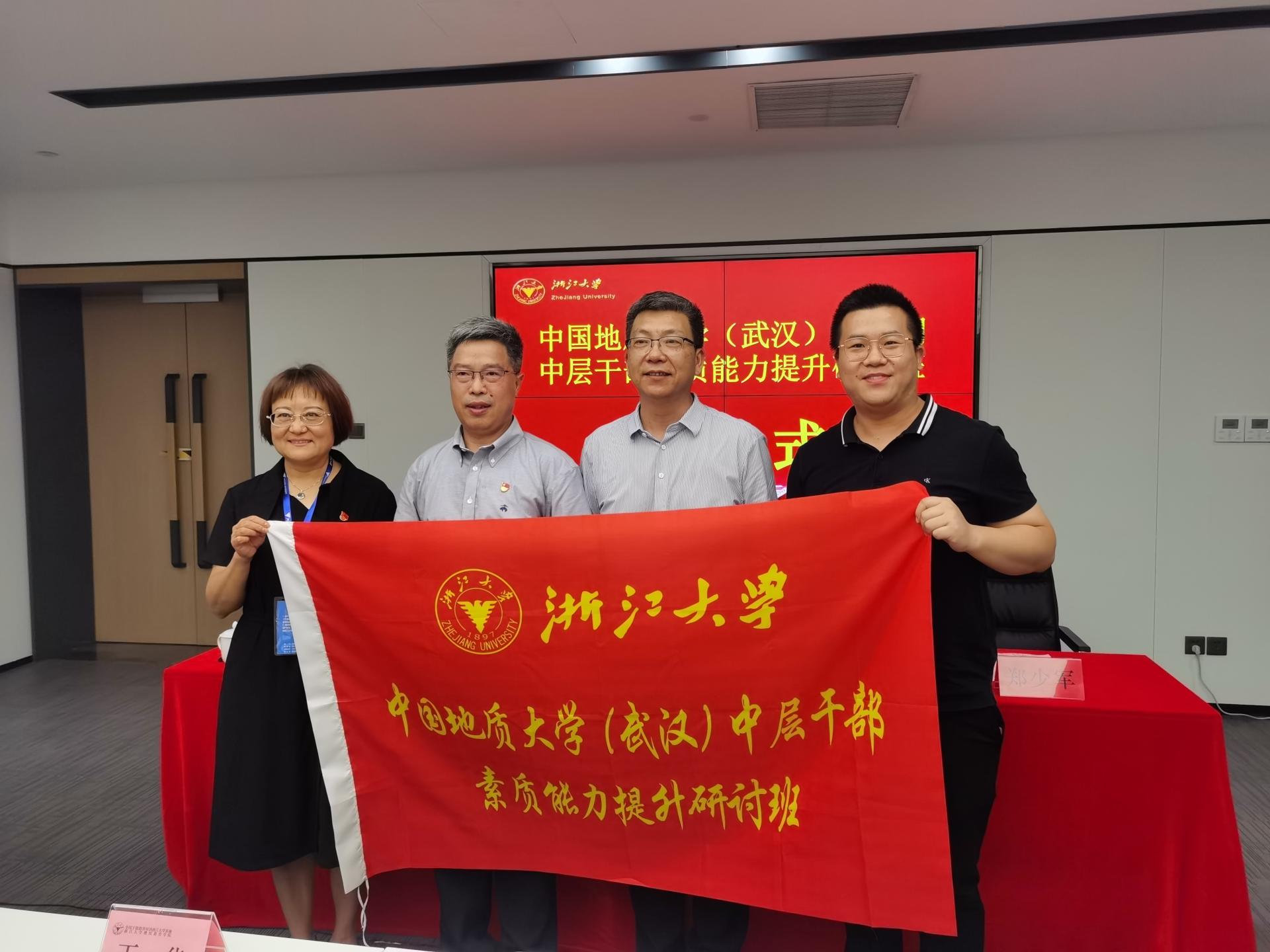刘继荣代表浙江大学继续教育学院向米兰党委组织部部长、党委统战部部长、党校常务副校长陈文武授班旗,研讨班全体学员参加开班仪式,会议由浙江大学继续教育学院华中区培训部副部长郑少军主持。