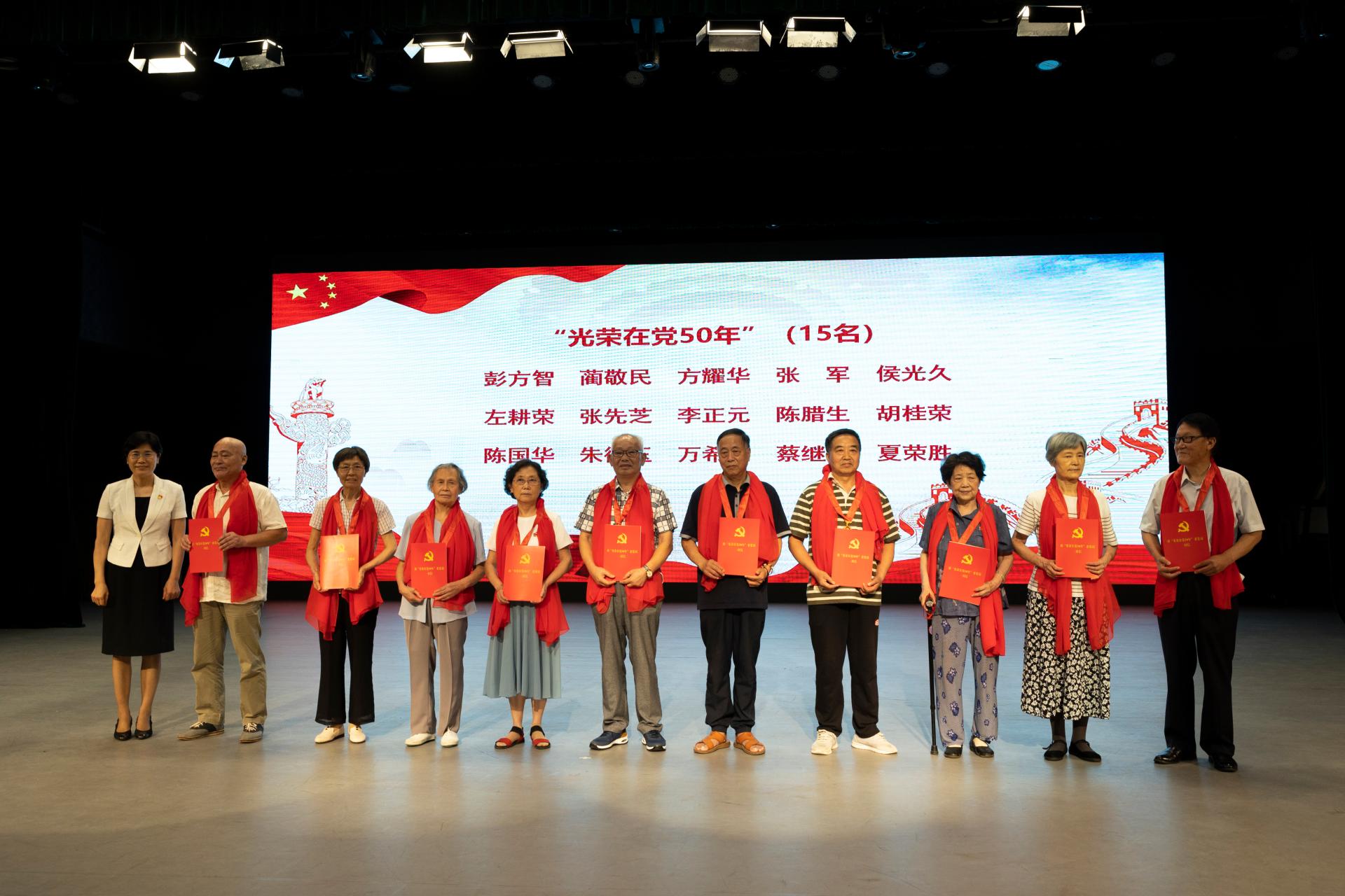 校党委书记黄晓玫为“光荣在党50年”老党员代表颁发纪念章。