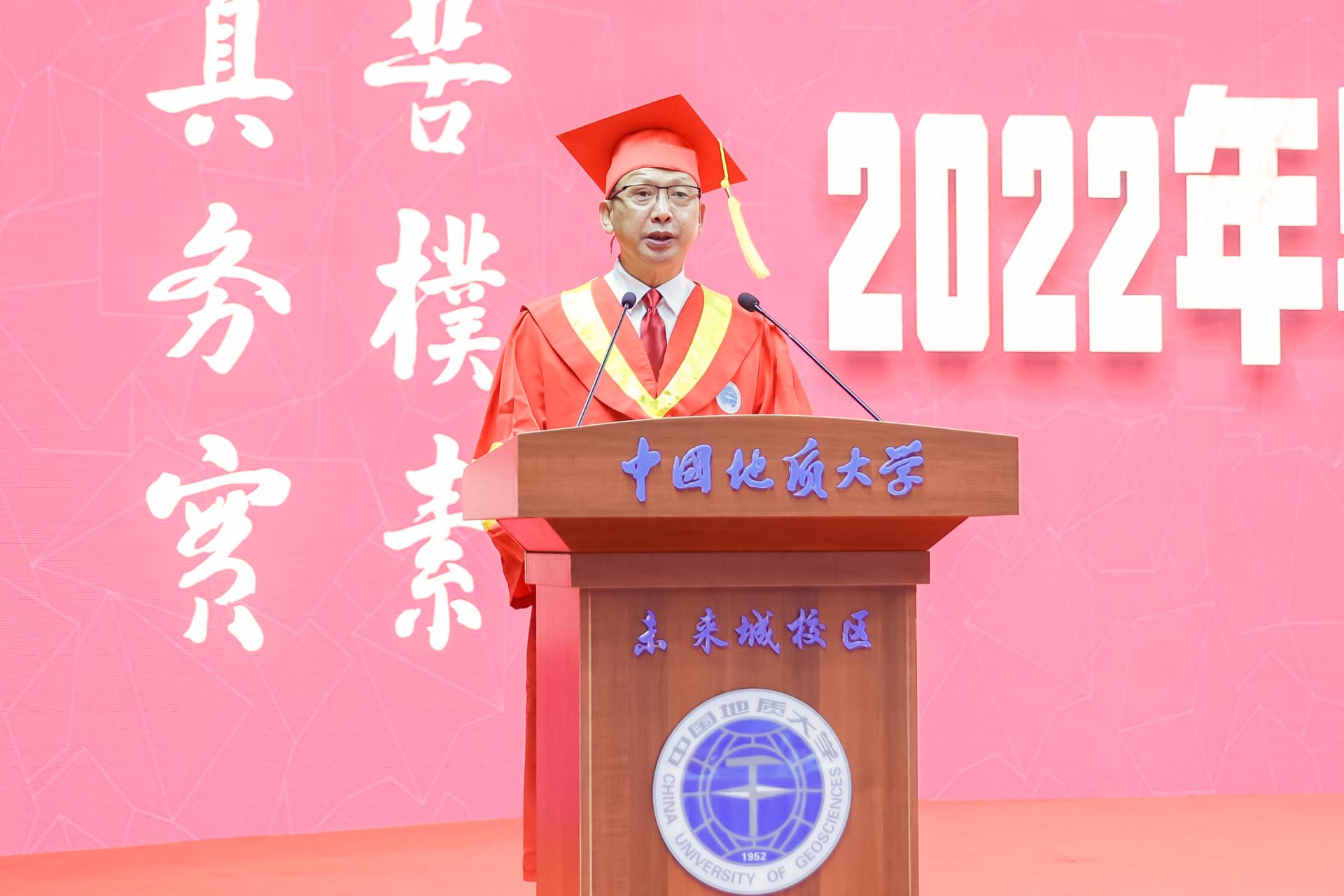 王焰新以《荣光与挫折》为题,深情寄语2022届毕业生。他说,凡是经历,皆是馈赠。几年前,同学们带着“一起建设这所伟大的学校,让她从卓越走向卓越”的期许开启地大之旅;几年间问道求真、勤学修身,在南望山下、未来城中寻初心、求真知、习本领,用真理定义人生,每一个毕业生都在地大挥洒青春汗水,留下拼搏印记,创造属于自己的精彩。“因为有你们,学校深感幸运;因为有你们,学校倍觉荣光”。