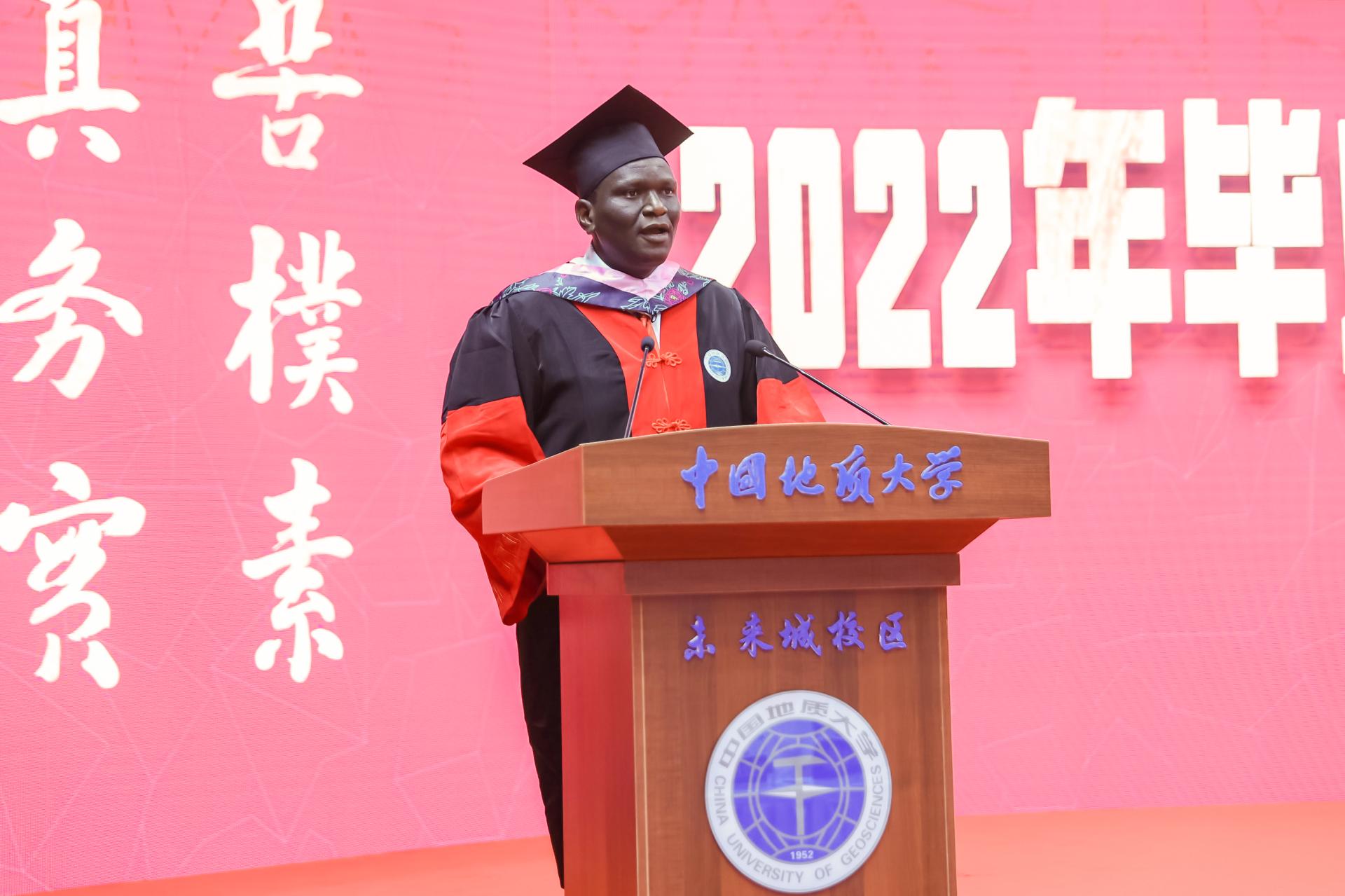 留学生代表、公共管理学院土地资源管理专业博士研究生大明同学发言。他说,八年沉淀了太多值得回味的地大故事,怀念在实验室和大家一起忙碌、在图书馆里阅读、食堂窗口阿姨热情地问“想吃什么”的日子。作为抗疫“钢铁侠”的一份子,他会把中国的大爱无私、中国文化的博大精深带回去,把美好的中国故事和温暖的地大故事分享给整个世界。