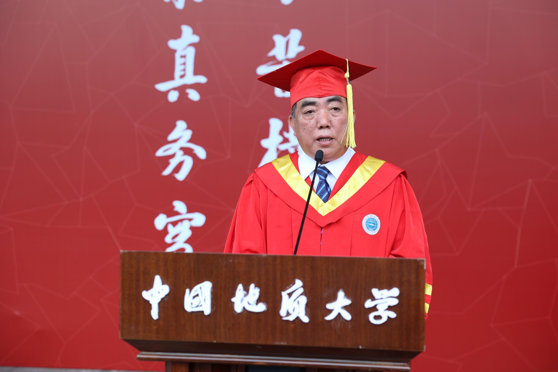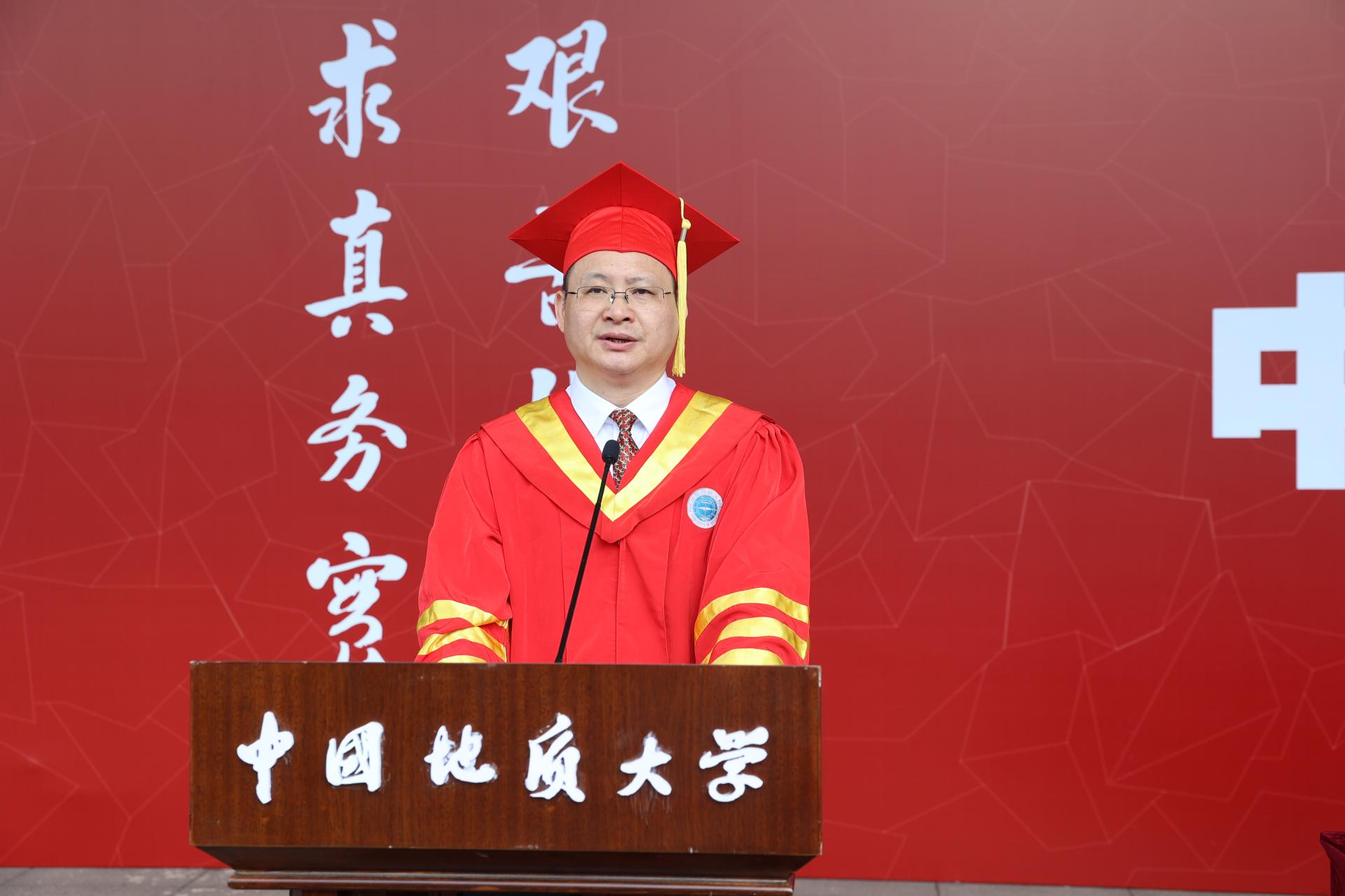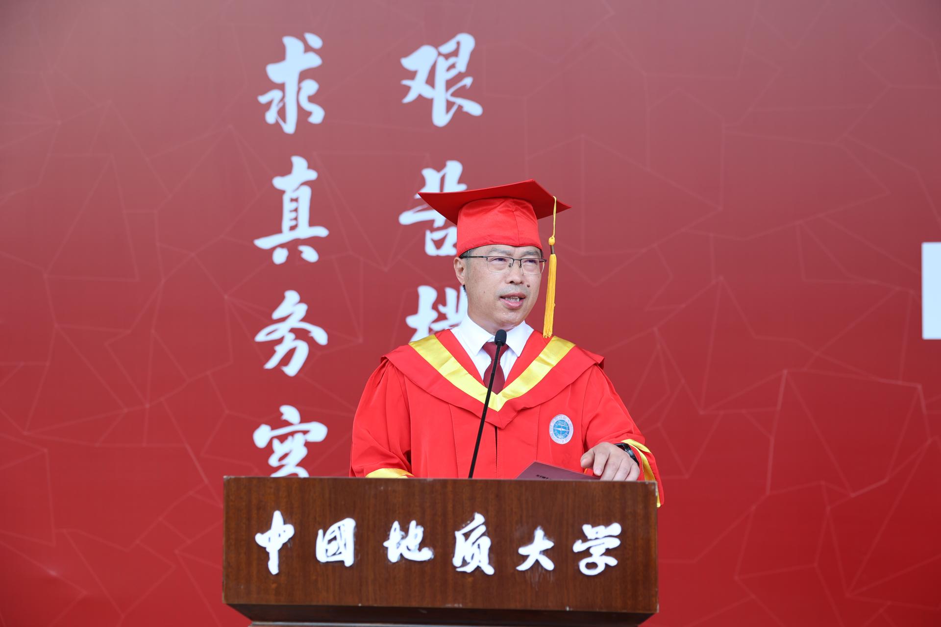 王焰新叮嘱即将奔赴星辰大海的毕业生们,“荣光源自挫折,挫折孕育荣光”,挫折,是苦难,亦是磨砺。它是阻碍成功之路的“坎坷”,更是通往成功之路的“阶梯”;它对弱者是“绊脚石”“泄气阀”,对强者却是“磨刀石”“加油站”。正如洪流奔涌,在岛屿、暗礁处方能激起美丽的浪花。“征途漫漫,挫折常有而信念不移;星辰大海,道阻且长但奋斗则至”。他希望同学们做“不断线的风筝”,飞跃山河湖海,始终牢记“地大人”身份; 做“不消散的电波”,保持永远蓄电、永不断电的状态;做“不褪色的 CUGer”,始终不改“艰苦朴素,求真务实”的本色,不断擦亮地大人的精神底色,不断增添大学精神的新亮色,为母校、为国家努力赢得新的更大的光荣。他希望同学们守初心、担使命,践行“一心爱国,奋斗一生”的誓言,秉持“为公与修己”的大道情怀、涵养“高贵与谦逊”的优良品格,领悟“伟大与平凡”“幸福与磨难”的人生真谛,在“远航与驻望”中成长为一名“精致与格局”并举的新时代青年,把“大志向”与“小幸福”落实到岗位上,在奋斗中绽放绚丽光彩,跑出当代青年的最好成绩。