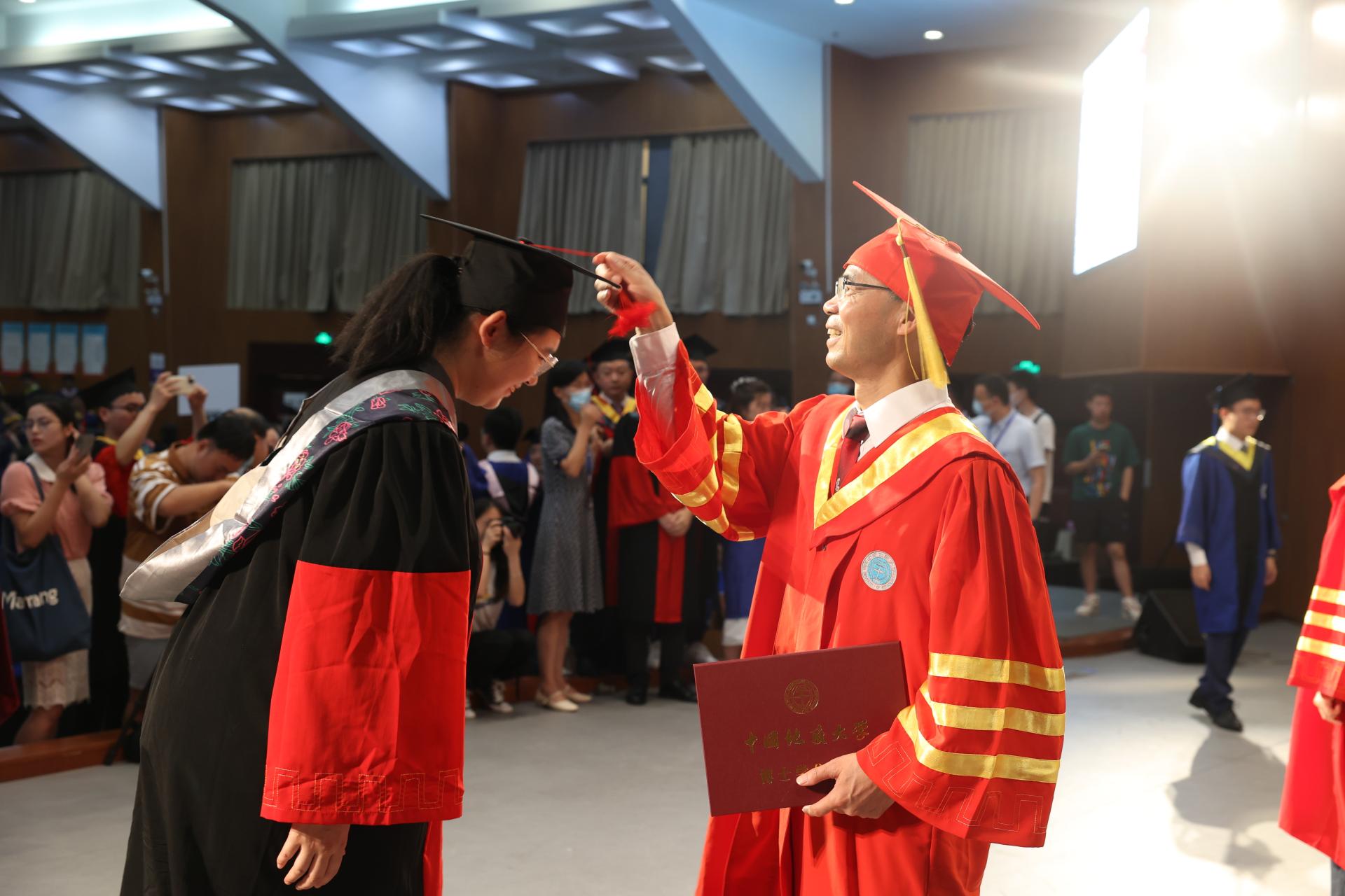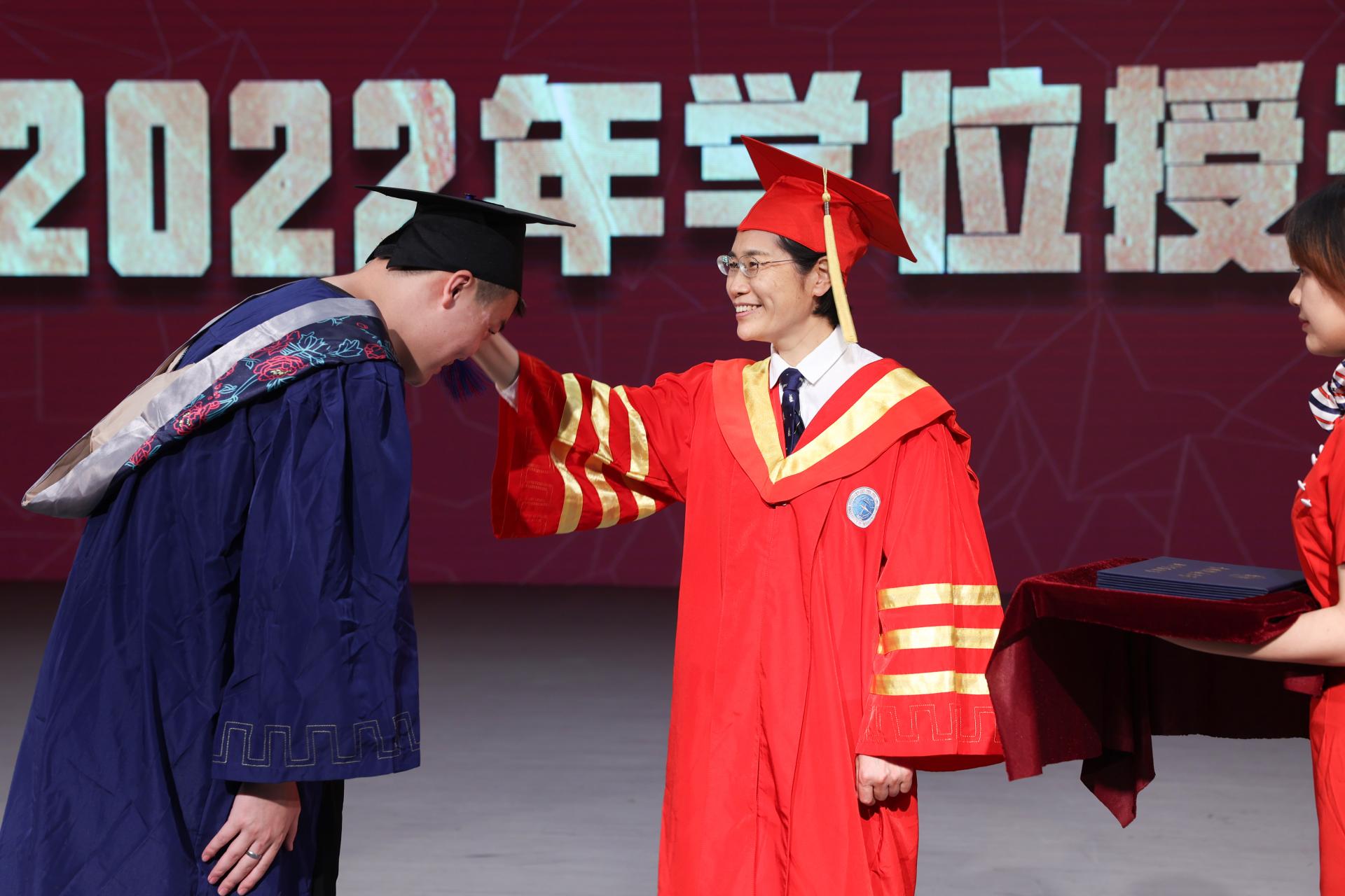 在毕业生学位授予仪式上,院士、校领导为2022届毕业生代表一一拨穗,并颁发毕业证书。
