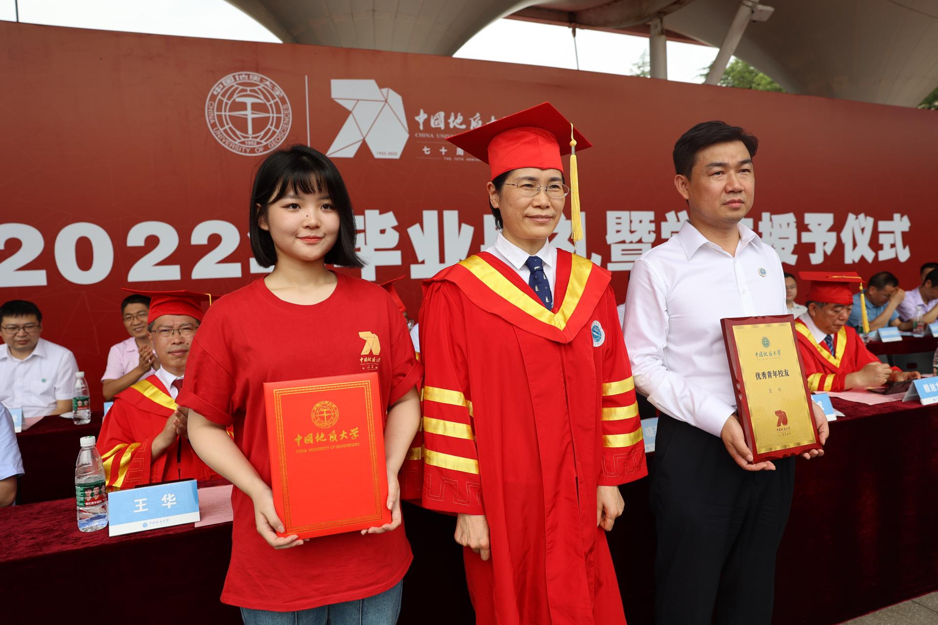 校党委副书记成金华宣读《2022届先进毕业班、优秀毕业生表彰决定》。地球科学学院x11184班、资源学院021181班、025181班等19个学院的31个毕业班集体获“先进毕业班”称号。蔡雨田等20个学院的481名本科生,曹国雄等22个培养单位的343名研究生,以及国际教育学院大明、安娜等8名留学生获“优秀毕业生”称号。