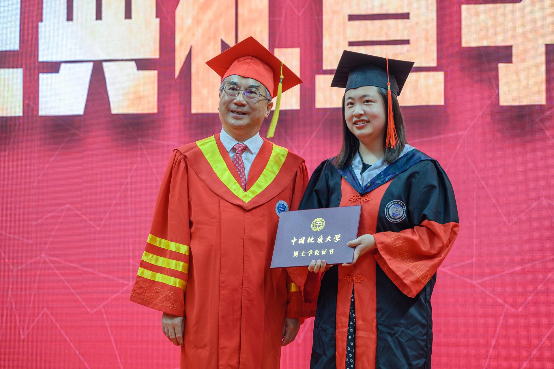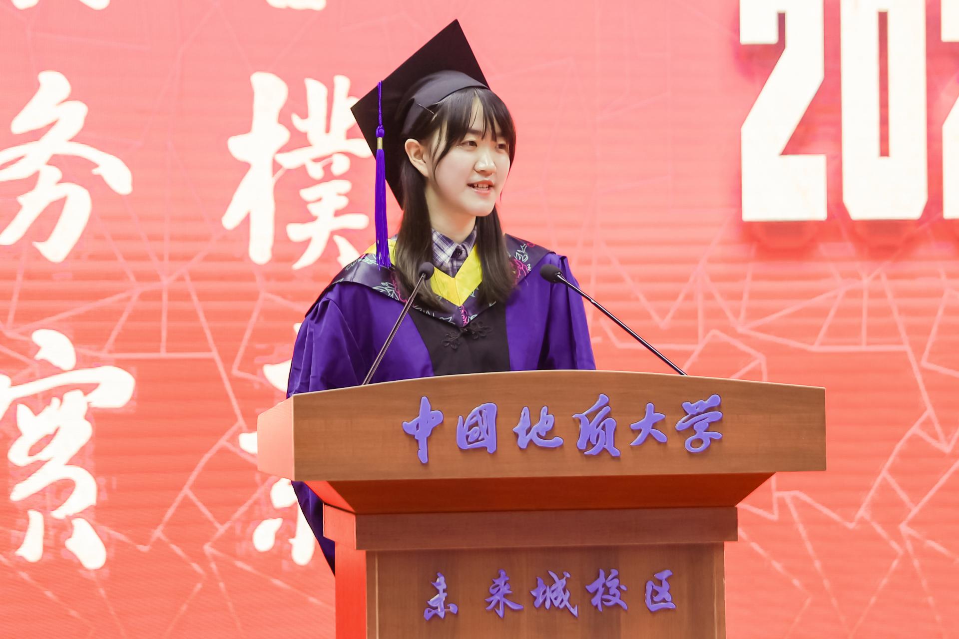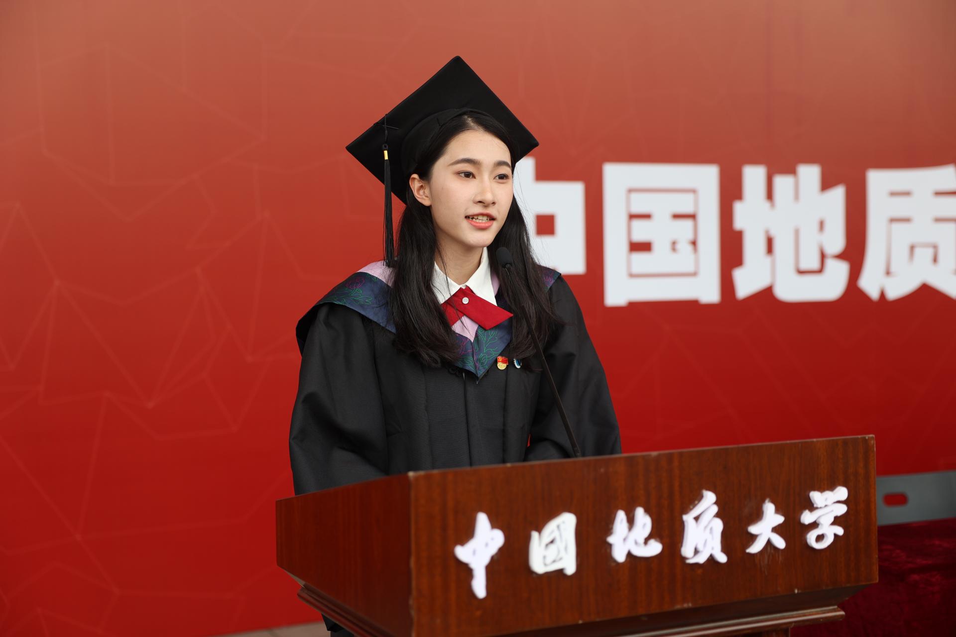 毕业研究生代表、海洋学院地质工程专业硕士研究生谢薇同学发言。她说,七年美妙的地大时光,让她留恋,地大每一个奋发的青年,让她感佩。他们将牢记“艰苦朴素、求真务实”的校训精神,涵养“无峰不可攀”的锐气和大无畏精神,秉持“会当凌绝顶”的宏大目标,让地大永不褪色的精神烙印,开启人生新的篇章。