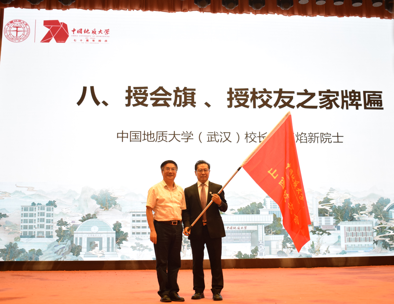 王焰新向山西校友会授会旗,仇铁强接旗。